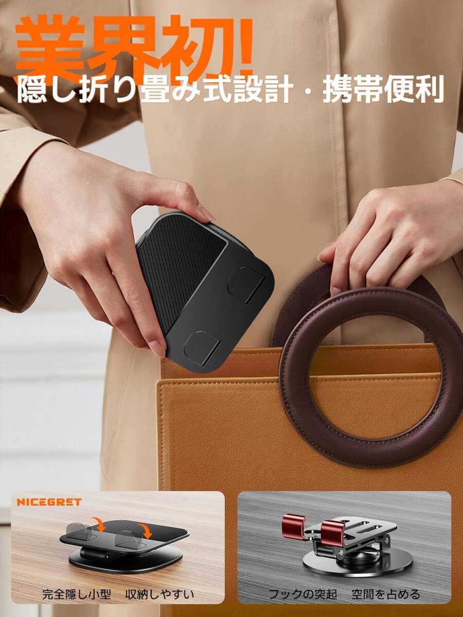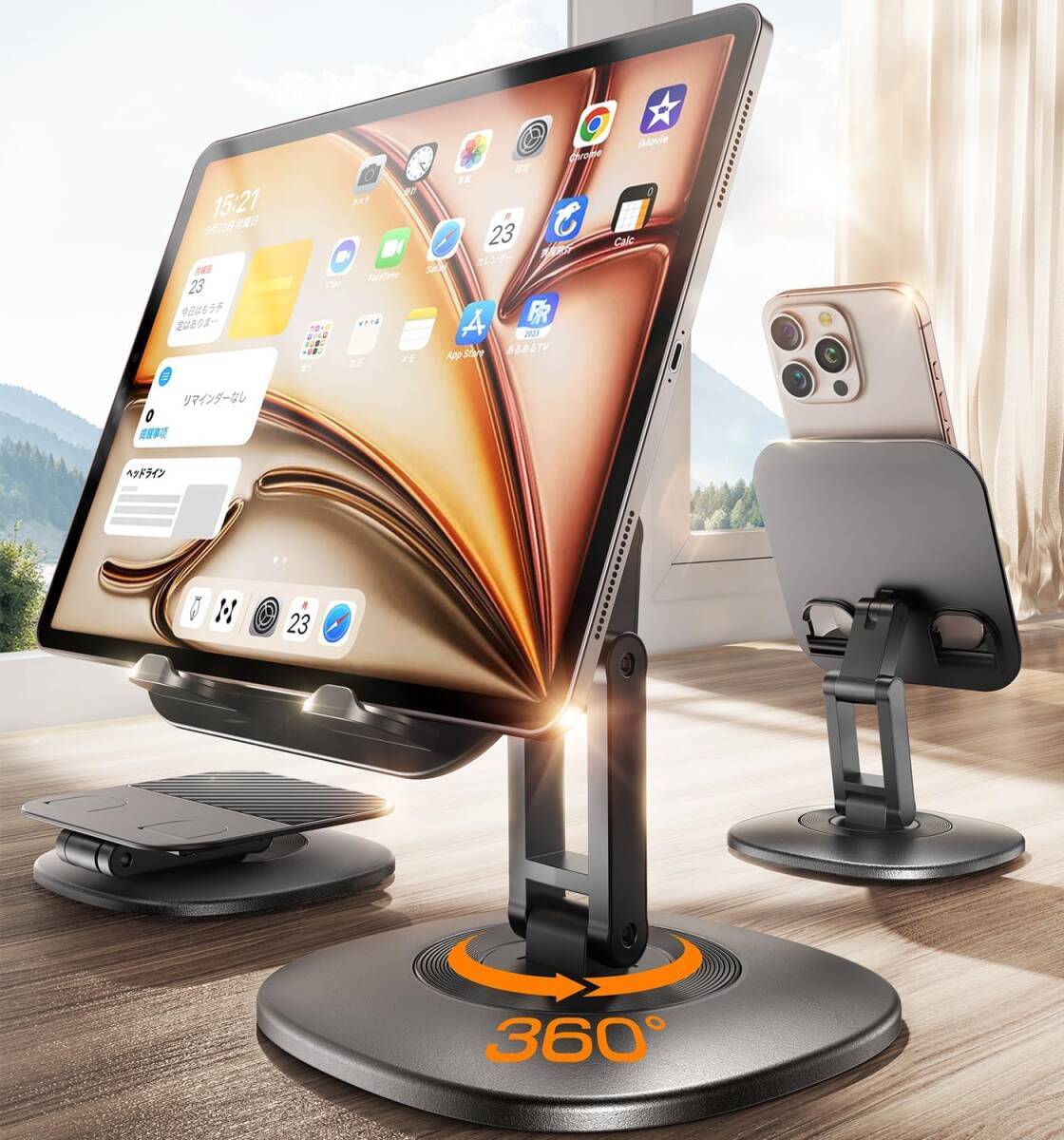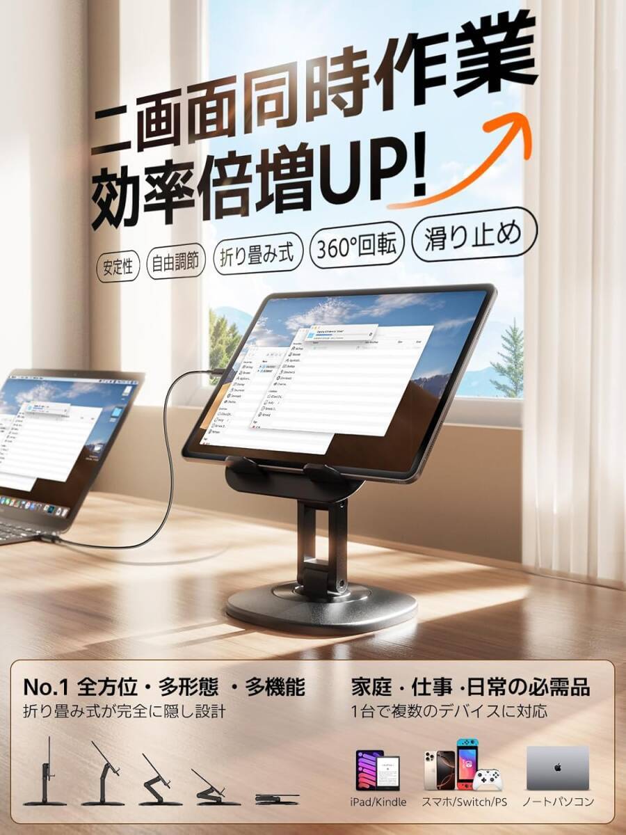 ipad スタンド タブレット スタンド 隠し 折りたたみ スマホスタンド 360°回転 スマホホルダー 軽量小型 タブレットスタンド 滑り止め iPad Pro/Air/mini/iPhone/Kindle/Macbook/Surface/スマホ 多機種対応 タブレットホルダー 家庭仕事日常卓上寝ながらの必需品+L型レンチ固定可能付き 【3Dプレミアム角度調整+安定性 3軸】A33A「最強の耐荷重、絶対に揺れない!」このiPadスタンドは、10.5mmの純金属加厚ベースを誇り、他社製品と一線を画します! 特別な4層精密構造(超精密強化分子、ナノ吸着強化層、炭素鋼金属ベース、EVE滑り止めシリコン)によって、通常のプラスチック製ベースに比べて安定性が10倍向上!最大22KGの耐荷重を実現し、置いた瞬間から揺れや傾きとは無縁です。さらに、面板接触面積は85%拡大され、安心してデバイスを置けます。付属のL型レンチを使ってLock機構で簡単に固定でき、長時間使用でも関節部分の緩みを防ぎます。一旦このタブレット スタンドを使用すれば、他のものはもう使いたくなくなり、揺るぎない信頼を感じられるでしょう!「3軸+360°回転、自在に調節可能!」:このiPadスタンドは、100%あらゆる角度とシーンに対応します。上軸180°、中軸270°、下軸180°、底座は360°回転と、各関節の可動性を最大限に引き出しています。また、L型レンチで簡単に角度調整が可能です。操作はスムーズで、柔軟かつ快適です。動画通話、イラスト制作、Kindle読書、リモートワーク、オンライン授業、映画鑑賞、料理、ベッドサイドでのエンタメ、ヨガやストレッチなどの居家運動、ライブ配信、FPSゲーム、多人数会議など、あらゆるシーンで快適さと最高のサポートを提供します!この自由調節可能なタブレットホルダーは、きっとあなたの日常生活に欠かせない存在となるでしょう。「業界初!完全隠し式の折り畳み設計」このiPadスタンドは、折りたたむとデスク上で本当に「完全に隠せる」形状になり、超コンパクトな形態で、あなたのオフィスを清潔で整然とした快適な作業空間に変えます。匠の技が光る炭素鋼とABS素材を使用し、滑らかでスタイリッシュな質感がどんな場所にも自然に溶け込みます。他社製品では折りたたんだ際にフックが突出しますが、このタブレットスタンドはフック部分を完全に隠すことができ、バッグに入れても場所を取らず、大切な物を傷つける心配もありません。軽量設計により持ち運びがしやすく、カフェ、オフィス、リモートワーク、出張先など、どこでも快適に使用でき、日常生活に完璧に溶け込み、効率的な作業をサポートします!「究極の耐久性、3重の滑り止め構造」:このタブレット スタンドは、高額を投じてドイツのトップデザインチームにより設計されました。三重の滑り止め構造により、安定性が75%向上し、2,341,366回のタッチテストにも無事に合格しています。高密度の斜めストライプシリコンを採用したパネルは、デバイスが触れただけで滑り落ちるのを防ぎ、滑りやすいパネルの安全リスクを解消します。ナノレベルの厚みを持つシリコンパッドを備えたデュアルフックにより、デバイスはしっかりと固定され、揺れることなく安定しています。10.5mmの純金属製のシリコンパッドを使用したベースは、優れた衝撃吸収と滑り止め効果を発揮し、大切なデバイスをしっかりと保護します。高級な防滑タブレット アームが、デバイスに長く耐久性のある保護を提供し、長時間の使用でも常に安定かつ安全にサポートします。[高コスパ!1台で複数デバイス対応」このiPadスタンドは、iPad、タブレット、Kindle、Switch、ノートパソコン、スマートフォンなど、様々なデバイスに対応しています。頻繁にスマホホルダーを交換する必要がなく、家庭、オフィス、旅行中やベッドサイドなど、あらゆるシーンで簡単にお使いいただけます。仕事、娯楽、日常生活を問わず、安定したサポートを提供し、どの場面でも快適で便利な体験を実現。携帯性にも優れ、必需品として常にお使いいただけます。