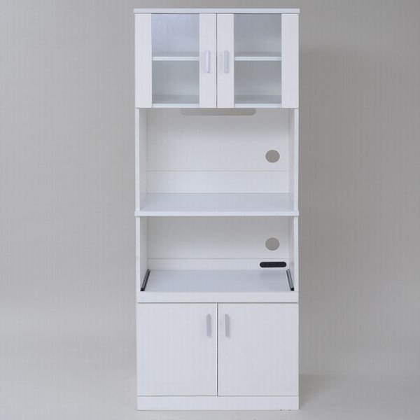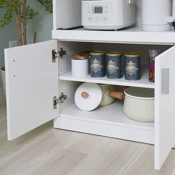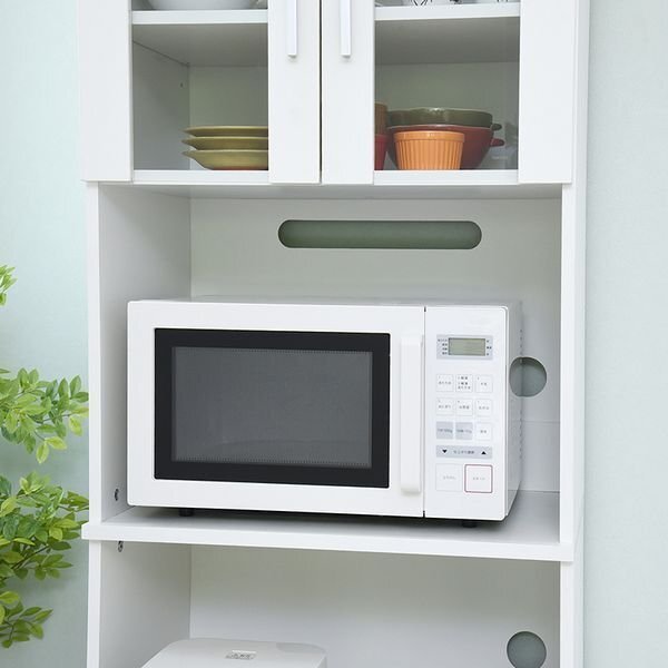 | シンプルなSIMシリーズのレンジ台。 キッチン家電も食器も一気に収納。 上部ガラス扉内にオシャレな食器を収納すれば、見せる収納が出来ます。 |