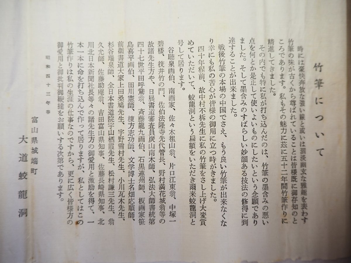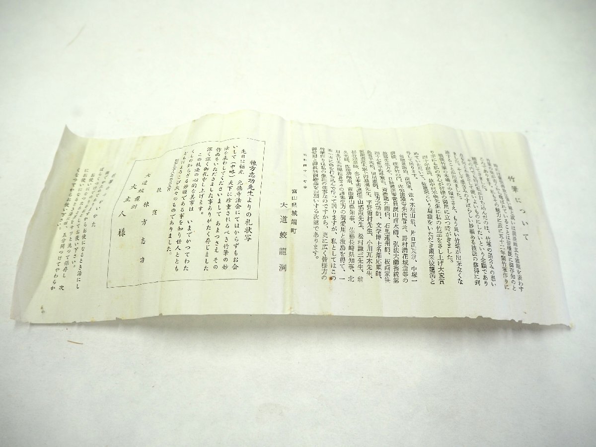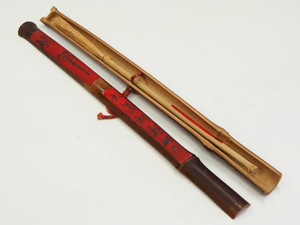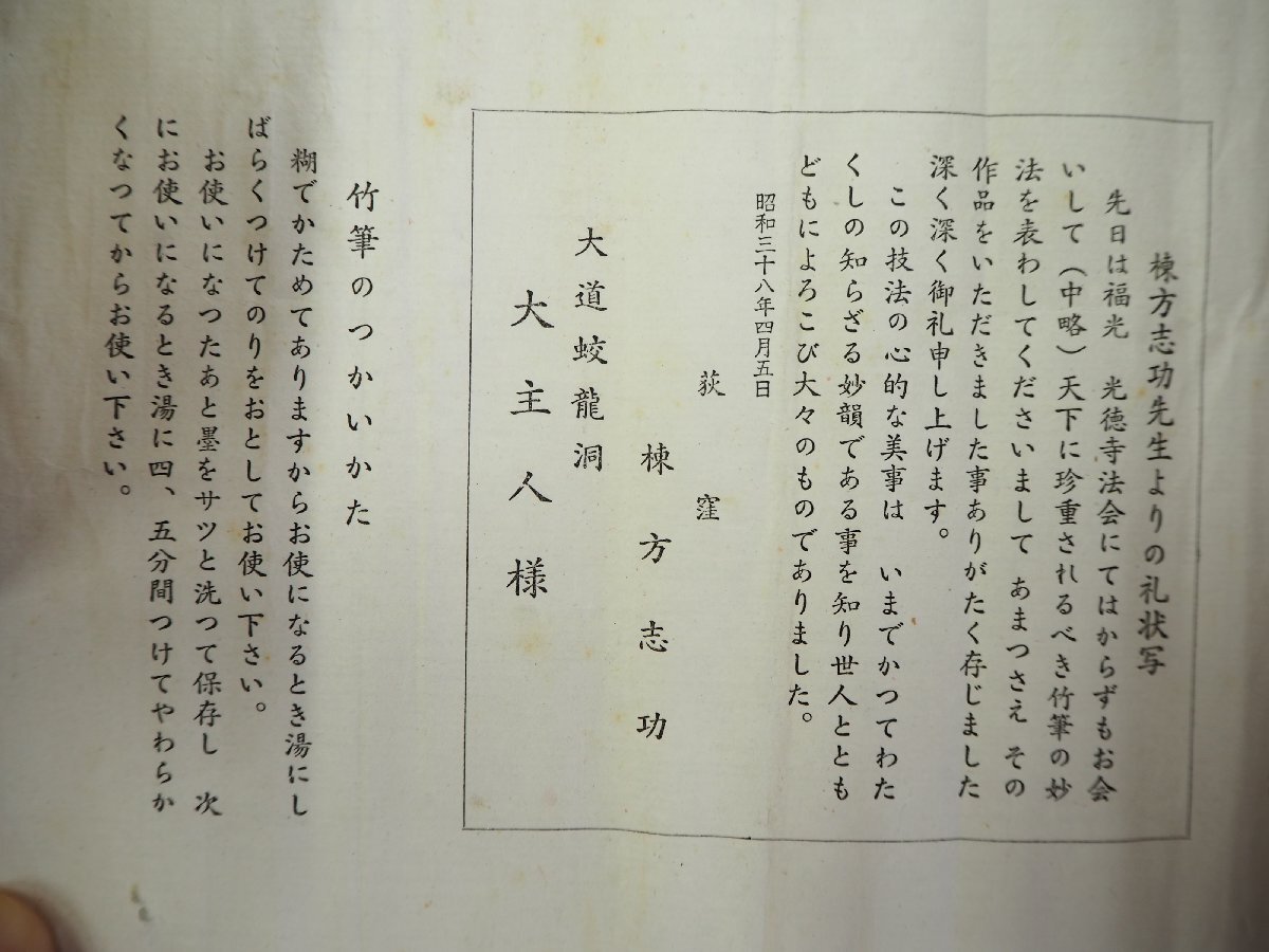 ★☆ 未使用 保管品【 竹筆 大道蛟龍洞作 富山城端 棟方志功の礼状写 長さ約31㎝ 】書道具 文房具 ☆★