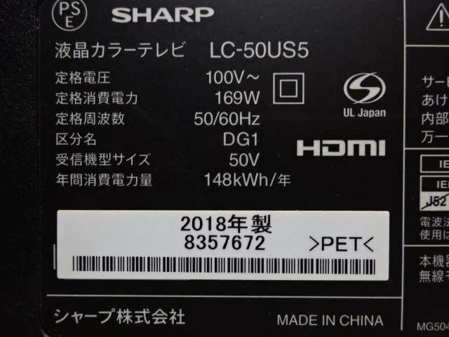A718☆SHARP/50型/4K/WIFI/Youtube/Netflix/AndroidTV/2018年製★LC-50US5 (店頭手渡し可能)