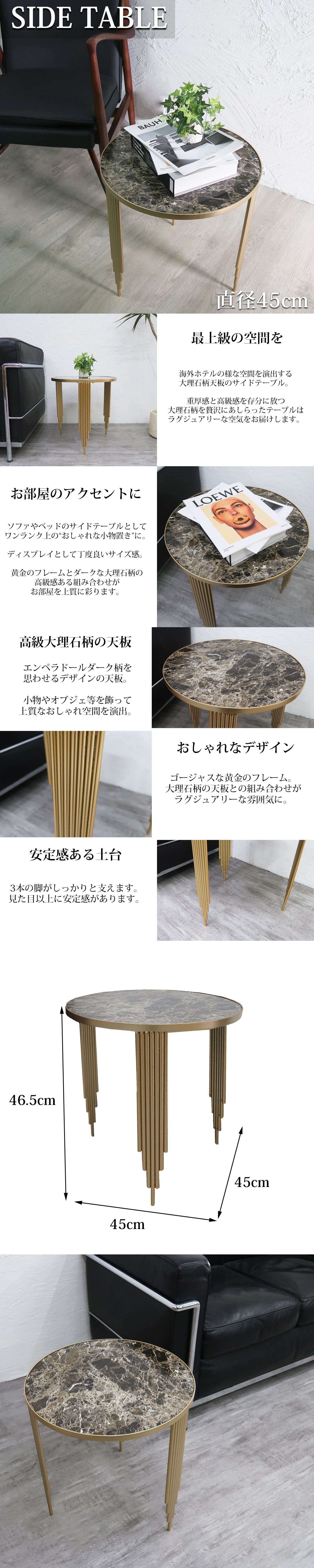 ![]() ※画像一枚目の商品になります。 最上級の空間を。 海外ホテルの様な空間を演出する大理石柄天板のサイドテーブル。 重厚感と高級感を存分に放ち、大理石柄を贅沢にあしらったテーブルはラグジュアリーな空間作りに最適です。 天板表面は綺麗に加工されており耐久性があります。 撥水性、キズに強く、拭き取り簡単でお手入れラクラク 。 黄金のフレームとエンペラドールダーク柄を思わせる大理石柄天板の組み合わせが 他にはない特別な空間を彩ります。 ソファ横、ベッドサイド、リビング等に置いてワンランク上のおしゃれな小物置きに。 高級感あふれるデザインが視覚的な楽しみも与えてくれるオブジェとしても楽しめます。 商品仕様 サイズ(約):天板直径45cm、高さ46.5cm 重量(約):3.45kg 材質:フレーム:鉄 天板:天然木化粧繊維板(ウォルナット) |