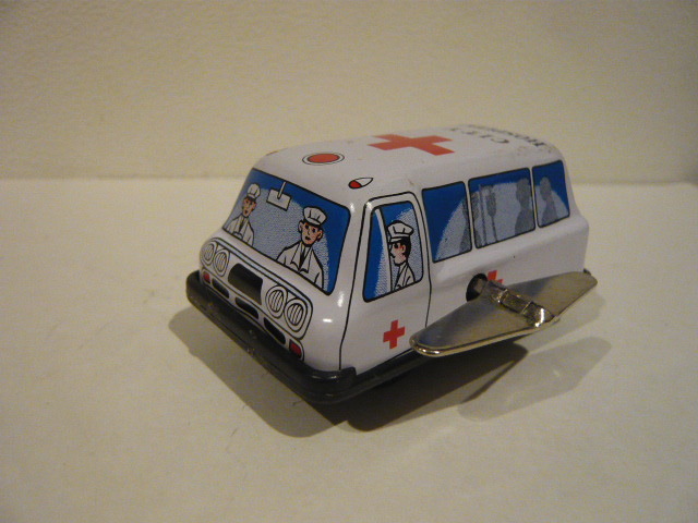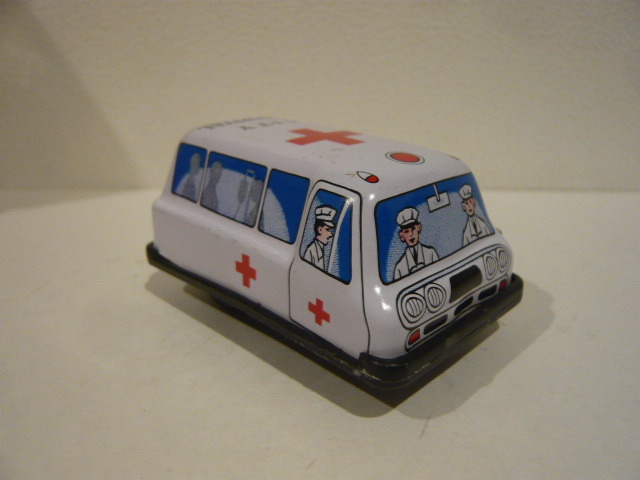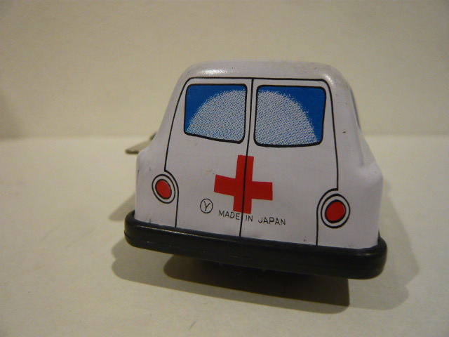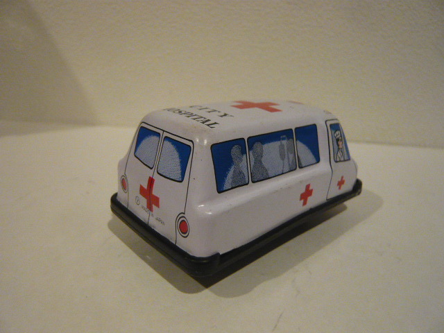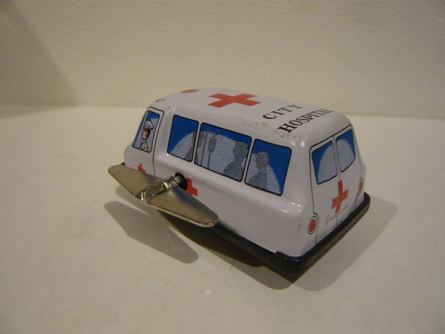 ●ブリキのおもちゃ CITY HOSPITALです●スケールは不明ですが、全長は80mm程度です。日本製●本体には、経年変化によるキズ、汚れ、錆等があります。ゼンマイは稼働しますが力強さはないです。パッケージ等はありません。写真にて程度ご確認頂き、ご了承の上、入札願います。