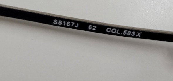 (1)フロント 135mm (2)レンズ 62mm (3)ブリッジ 16mm (4)天地 34mm (5)掛け幅 135mm (6)テンプル 145mm