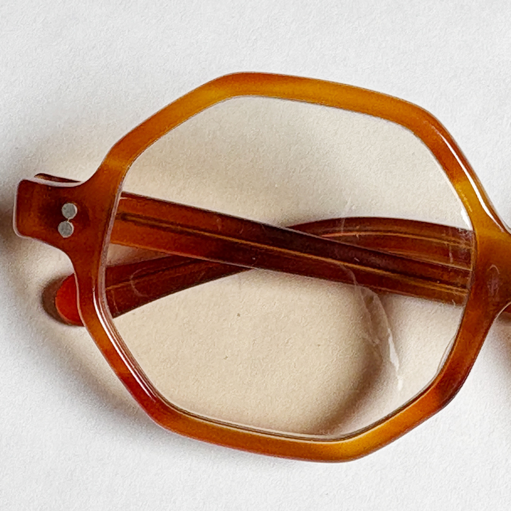 素材はこの当時のフレンチフレーム特有のセルロイド製。近年ではアセテート製の物が主流ですが、セルロイドの方がより加工性と透明性に優れ、発色の良い質感が特徴。
