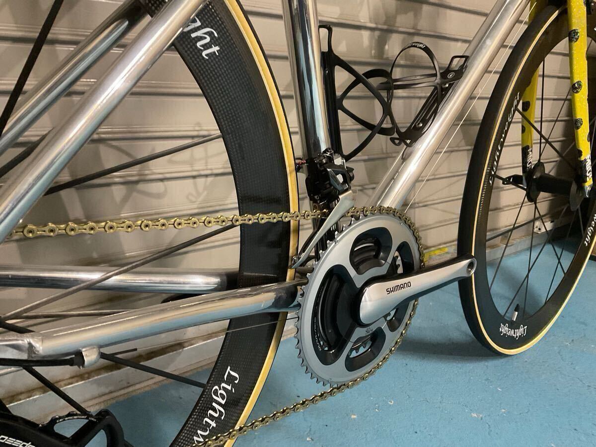 フレームはアルミ製のGT Strike 塗装を剥離し磨き仕上げにしておりますがオブジェ期間が長く少し曇っております。一度磨き上げた車両なのですぐに輝きを取り戻すと思います。