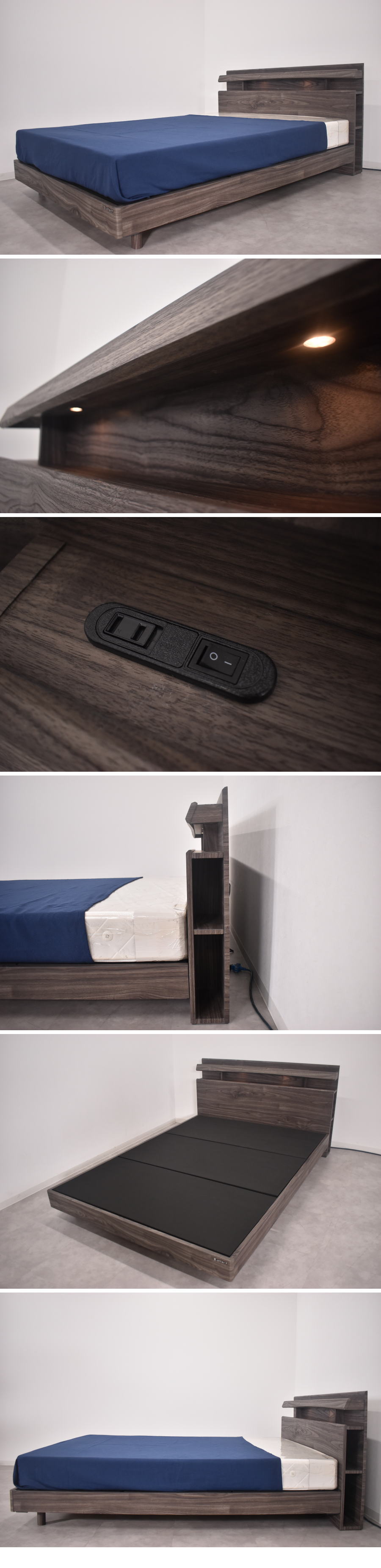 3Dプリントのブラックウォールナット柄が美しい 高さ調整サイドラックLED照明コンセント付きダブルベッドです。 耐荷重200Kで2段階高さ調整ができます。 宮部分はタブレットや小物が置けスマホの充電などに便利なコンセントが付き 機能的なサイドラック付きです。 ※マットレスは付属しません、本体のみの販売です。 |