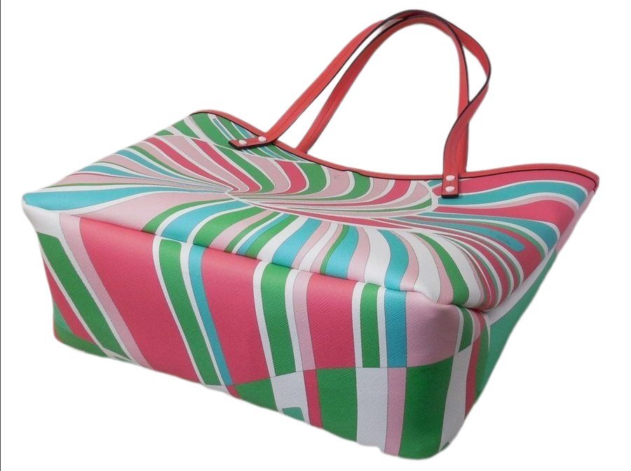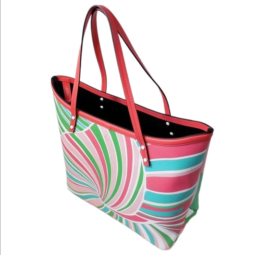| 素材、カラー | 表地は合成皮革(アクリル55%、ポリエチレン30%、コットン15%)、裏地はコットン100%、トリミングとハンドルはカーフレザー80% コットン20%、カラーはピンク系マルチカラー、金色の金具 |