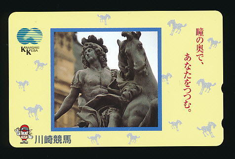 ●625●川崎競馬★中世西洋人と馬のブロンズ像オブジェ 【テレカ50度】●