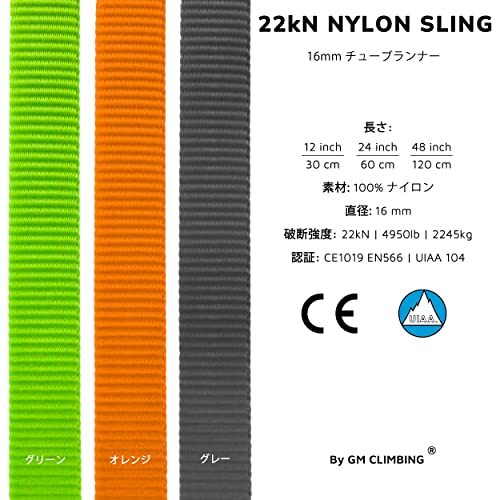 「GM CLIMBING UIAA CE 認証 22kN 16mm ナイロンスリング ランナー クライミングスリング 長さ 60cm オレンジ 1」▼▼(商品説明)・オレンジ 60cm x 1本入り ・・Color:オレンジSize:60cm x 1本入り・GM CLIMBINGの22kNナイロンスリングは、柔らかくて耐久性に優れ、高強度と軽量化を兼ね備えます。CEおよびUIAAにより認証済み、3サイズがあり、非常に便利で多目的に使用できます。・補強ステッチ◆◆◆柔軟性のあるチューブ式のナイロンウェビングにより製造されるナイロンスリングは、さらに縫い目を補強し、より丈夫で耐久性に優れるように、バータックという補強用のステッチを使用します。スリングはより丈夫で摩耗に耐えられ、毛羽立つことも有効に防止でき、より長く使用できます。・コンパクトで軽量◆◆◆軽くて持ち運びやすいナイロンスリングは、多種多様な用途で活用されます。汚れにくいグレーと、森の中でも目立ちで鮮やかなグリーンとオレンジの3カラーがあり、屋外でも簡単に識別できます。16mmの直径と長さ30cm、60cm、120cmの3サイズを提供します。・CEとUIAA認証済み◆◆◆CEおよびUIAAにより認証済みのナイロンスリングは、22kNの破断強度を持ちます。中空のチューブ式タ素材: ナイロン(br)メインカラー: オレンジ(br)直径: 16mm(br)長さ: 60cm(br)破断強度: 22kN / 2190kg(br)重量: 42g(1本)(br)認証: CE1019 EN566