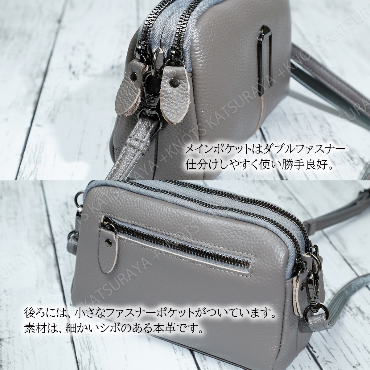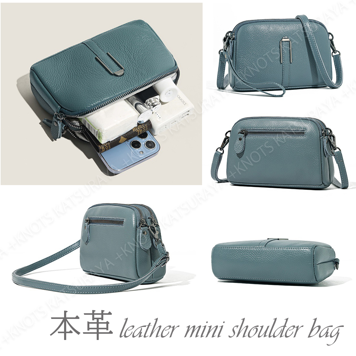 ころんと愛らしいフォルムのミニバッグ。ちょっとのお出掛けに、スマホショルダーとしてやお財布ポシェットとして重宝します。ハンドストラップが付属しますので肩紐を外しクラッチバッグやお財布としての使用もおすすめ。メインポケットは2層のダブルファスナーで使い勝手良好。細かいシボのある本革素材はキズや汚れが目立ちにくく上品な印象です。
