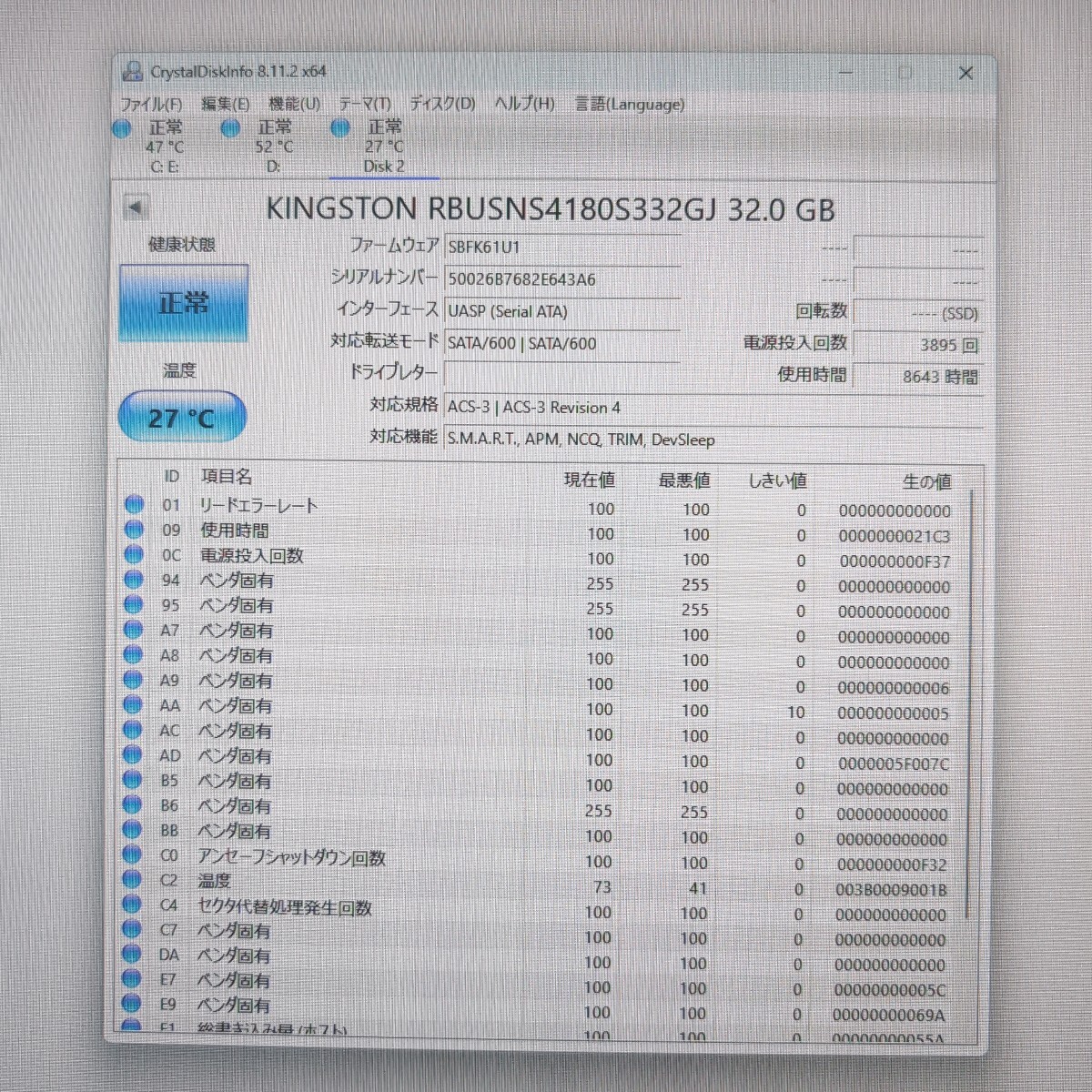 | 商品説明 | m.2 2242 SSD 8枚セットでの出品です。 CrystalDiskInfoにて表示されている健康状態につきましては、出品時現在の時点での状態です。 CrystalDiskInfoが示す健康状態はあくまで目安であり、快適な動作を保証するソフトではございません。 出品作業にあたり「電源投入回数」や「使用時間」「その他のステータス値」に若干の相違が発生する場合があります。 これまで「健康状態が掲載地点と違っていた」等のクレームをいただいた事はありませんが、 ストレージの特質上、品物到着までに健康状態が変わる可能性があるかもしれないという事をご了承下さい。 その他の状態は画像よりご確認ください。 「データ消去」と「CrystalDiskInfo」による検査のみになります。 完動品かどうかまでのチェックは行っていません。 ご了承頂ける方のみのご入札とさせていただきます。 領域(パーティション)作成方法やフォーマット方法がわかる等、ある程度知識のある方でお願いします。 過去に「フォーマットが出来ない」「OSがうまくインストール出来ない」等で、 返品要望のご連絡をいただく事があり、ご返送いただいた後に当方で確認したところ品物自体には問題なく正常だったという事が度々ありました。 それらの理由からノークレームノーリターンノーサポートとさせていただいています。 そのかわりに1円スタートで出品させていただきます。 |