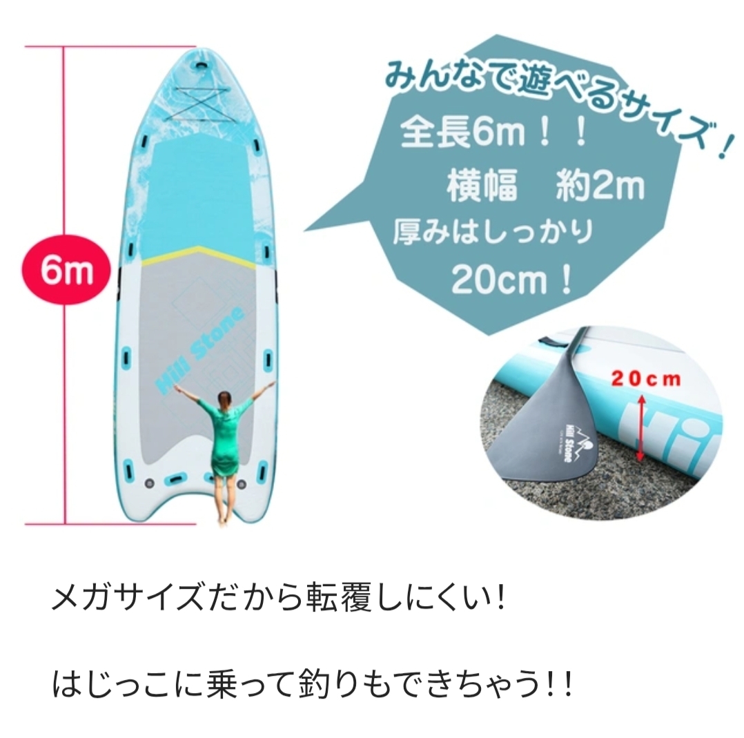メガサップの出品になります。長さも約6m、巾も2m位あります。大人が数人乗っても大丈夫のようです。このSUPで魚釣りをしようと新品で購入しましたが、使用する機会がないため出品致します。値段は12万円位で購入しましたので、お買い得です。