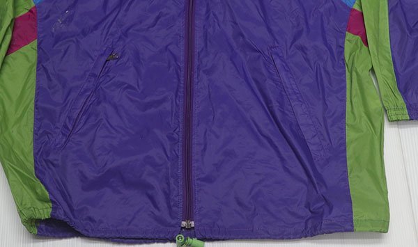 アメリカ買い付けの90年代頃の旧ロゴのアディダスのナイロンジャケットで襟にパーカー収納可能の青紫系Xピンク系X緑系x青系xチャコールグレーです。