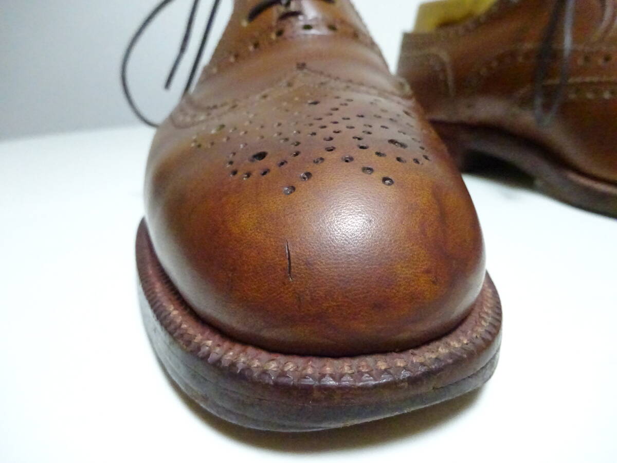 【コンディション】アッパー、両足薄い履きシワ、左足トゥ左小キズ、右足トゥ先細いキズ、両足トゥほんの薄い色落ち、左足内側ウェルト付近に薄い汚れ、両足ヒールカップ内側ほんの小さな汚れが見受けられます。艶は残っているものになります。インソール、細かなスレ薄汚れ見受けられます。特に目立った汚れダメージは見受けられません。ソール、ヒール、やや減りが見受けられます。