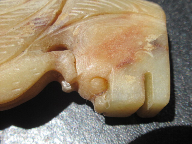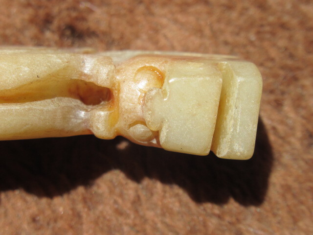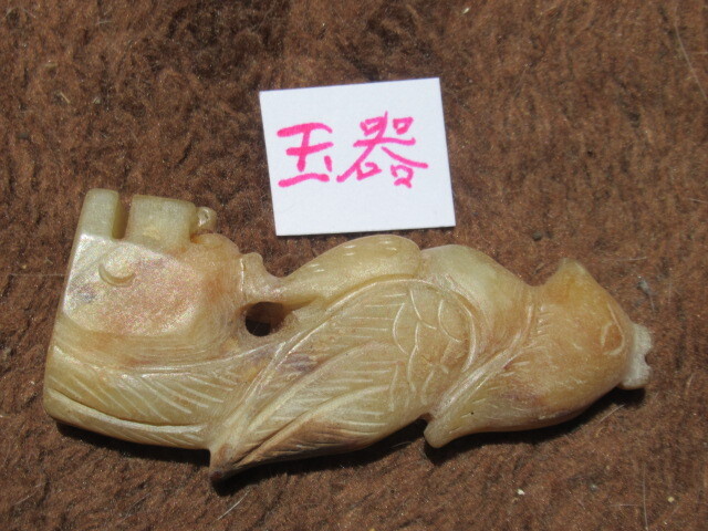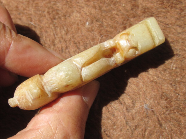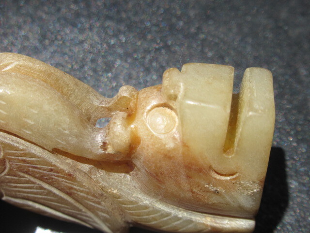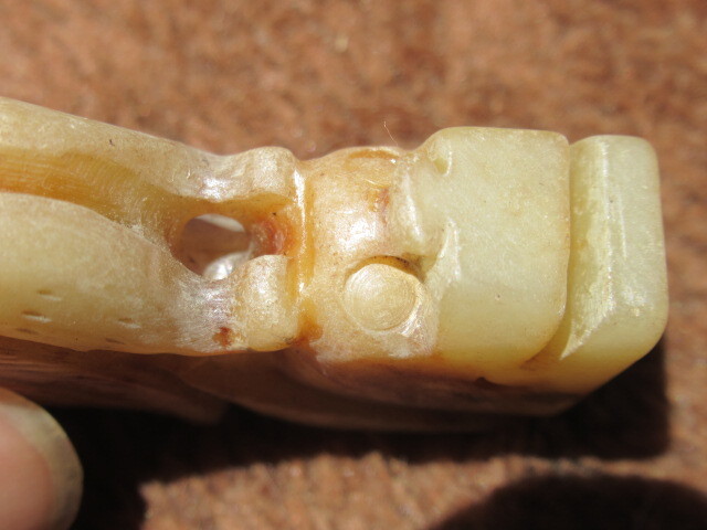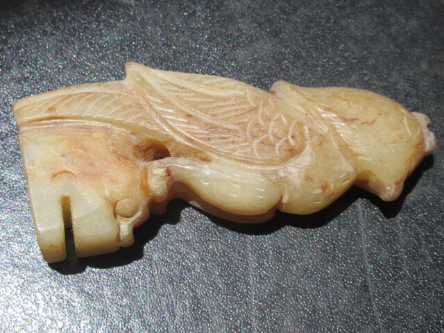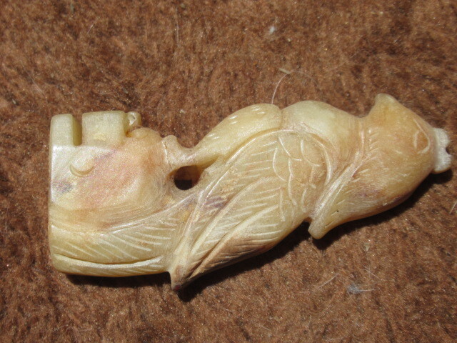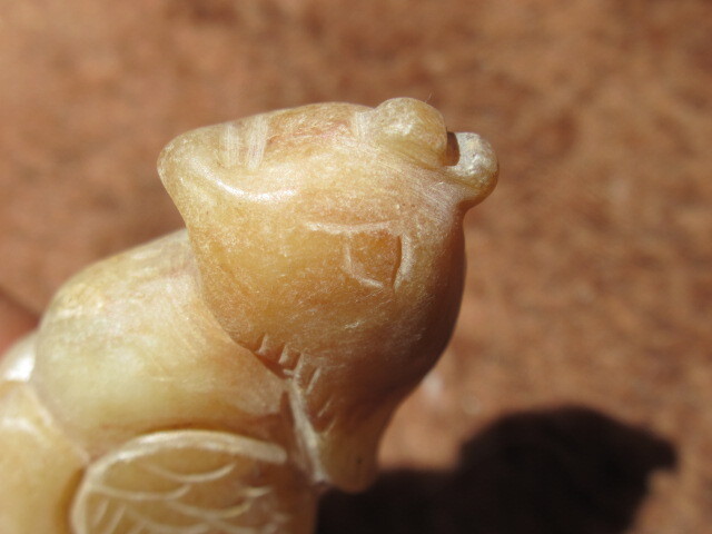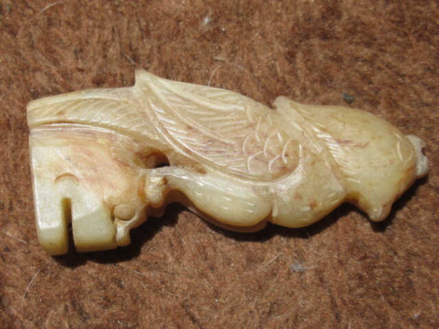 未鑑定品。崑崙系の若キョウ(チャルクリク)産黄玉様の玉質。簡素な彫りの獅子頭にトサカがある鳥が乗るモチーフ。穴は鳥の足元だけに3穴で、バランスから吊り下げる用途ではなく、印材的デザイン。タテヨコ厚さ63/22/11m。送料無料。