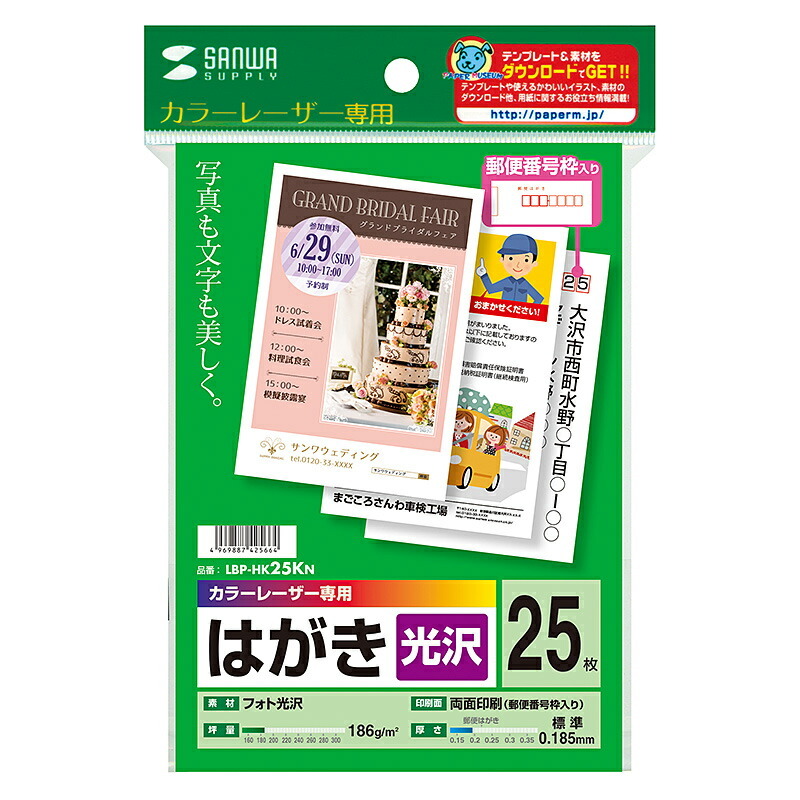 カラーレーザー専用のはがき。つやのあるフォト光沢タイプ。25枚。