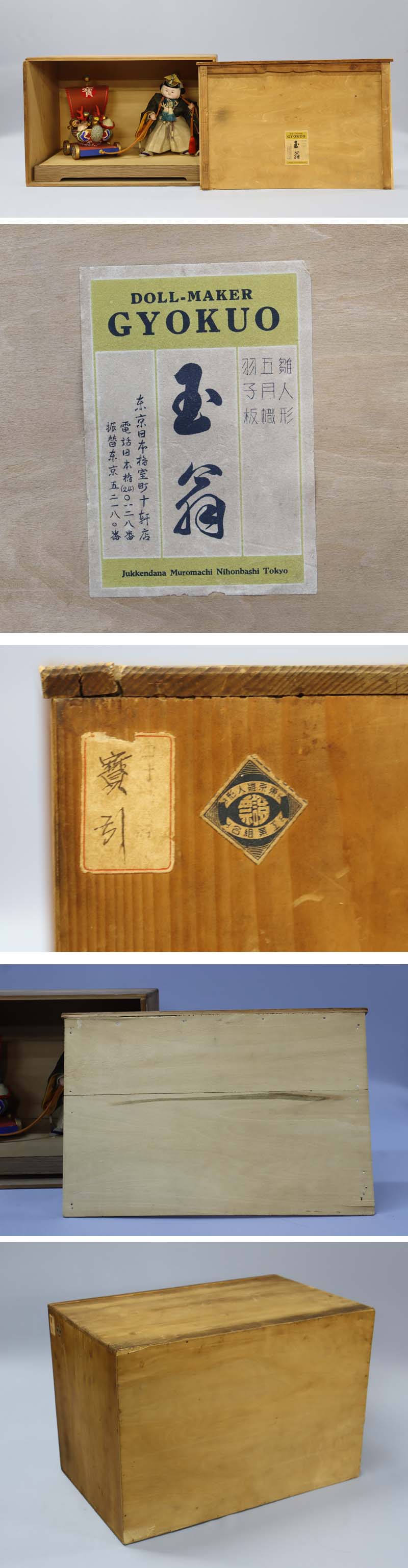 箱の横に【東京雛人形工業組合】のラベルと【宝引】の貼り紙が付いています。