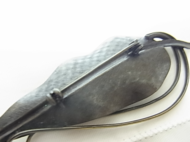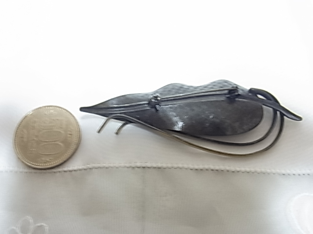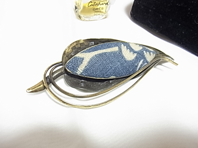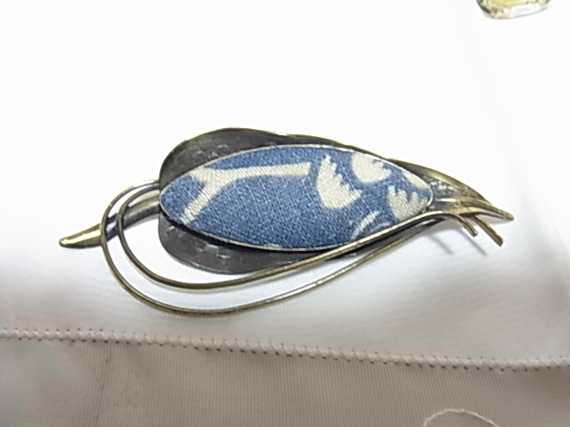 ビンテージ/ヴィンテージ 和テイスト 和モダン ブルー系の布生地 青 8×3.5センチ位 インパクト 和装にも素敵 昭和 ブローチ▲