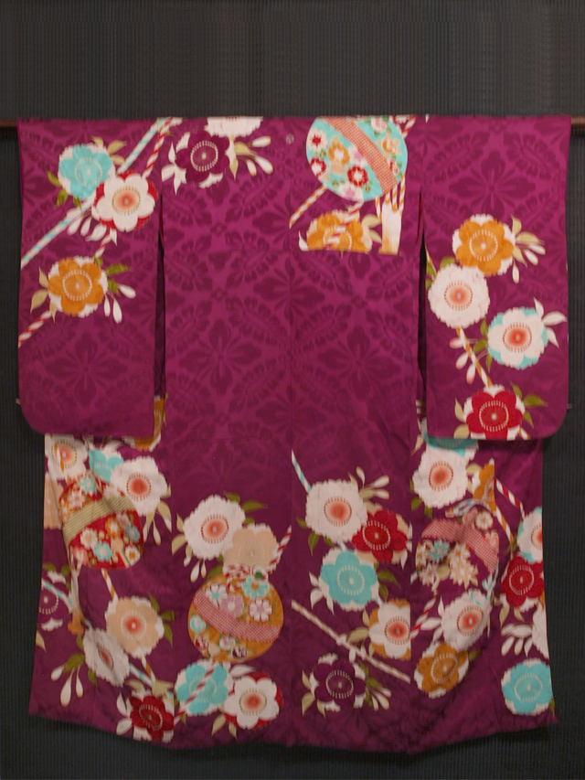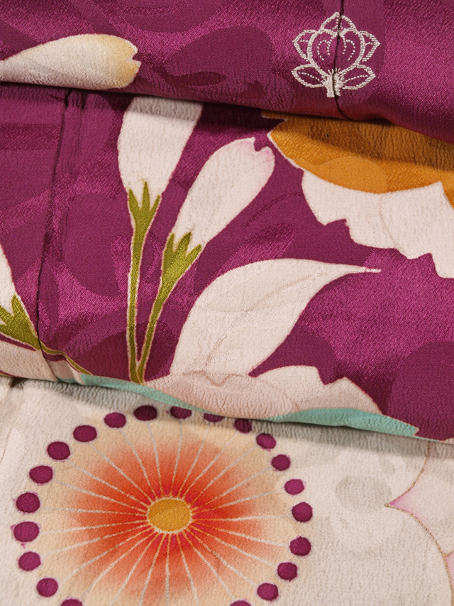 | 詳細 | やや暗紅色(あんこうしょく)がかった濃紅(こいくれない)色の地に花七宝の地紋が織り出され、手毬(てまり)と八重桜、紐の文様が友禅染めされている綸子縮緬の訪問着です。袷仕立てです。 大正~昭和初期ごろにつくられたと思われるアンティークのお品です。光の加減で浮かび上がる花七宝の地紋も大胆にに配された文様も、アンティークならではのかわいらしさあふれる趣きです。 文様の白色地部分が全体的にうっすらとくすみ、わずかに黄変気味です。左前袖袖口下に直径約 1cm のうすよごれが 3~4 か所、左後身ごろの膝裏付近に直径約 1mm のよごれが 1 か所、上前身ごろの膝下に直径約 1cm のうすよごれが 1 か所、上前衽の膝上に直径約 5mm~1cm のよごれが 3~4 か所あるなど、全体のところどころにこまかなよごれが若干ありますが、いずれも目にはつかず、気にはならなさそうです。そのほかに目につく大きなしみやよごれ、褪色などのダメージはなく、この時代のものとしてはきれいな状態なので、アンティークにご理解のある方であればご着用は可能です。 |