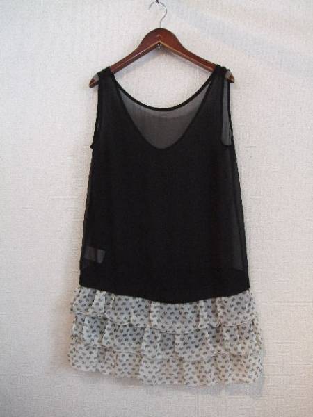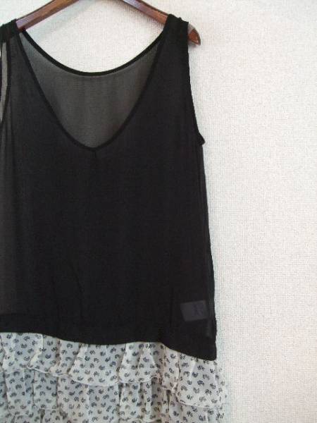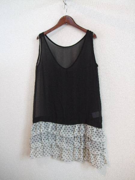 | 商品紹介 | 裾の3段ティアードフリルがカワイイノースリーブチュニックです。 本体は黒の無地で、裾のティアードは白地に細かい木の枝のような プリントが黒で入っています。 透け感のあるシフォンの軽やかな素材です。 ※透け感がありますので、別にインナーが必要です。 イトキン社製ですが、ブランドタグが無く、どこのブランドかは不明です。 《素材》 本体・附属部分:ポリエステル100% |