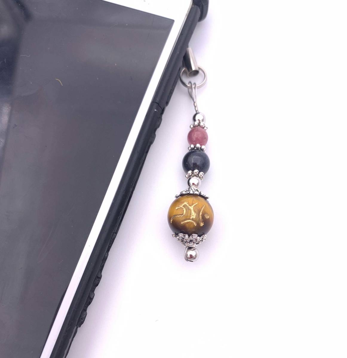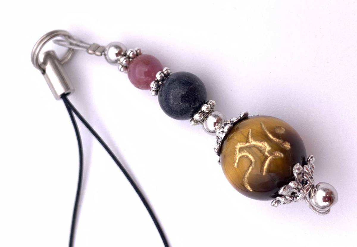 天然石タイガーアイ守護仏梵字金彫り12mm玉&サファイア&ルビーのストラップ