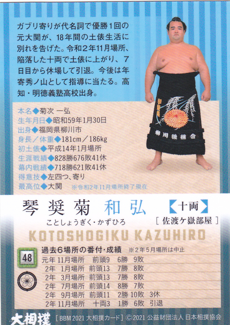 BBM2021大相撲カード 48 琴奨菊 佐渡ケ嶽部屋 十両 福岡県柳川市 明徳義塾