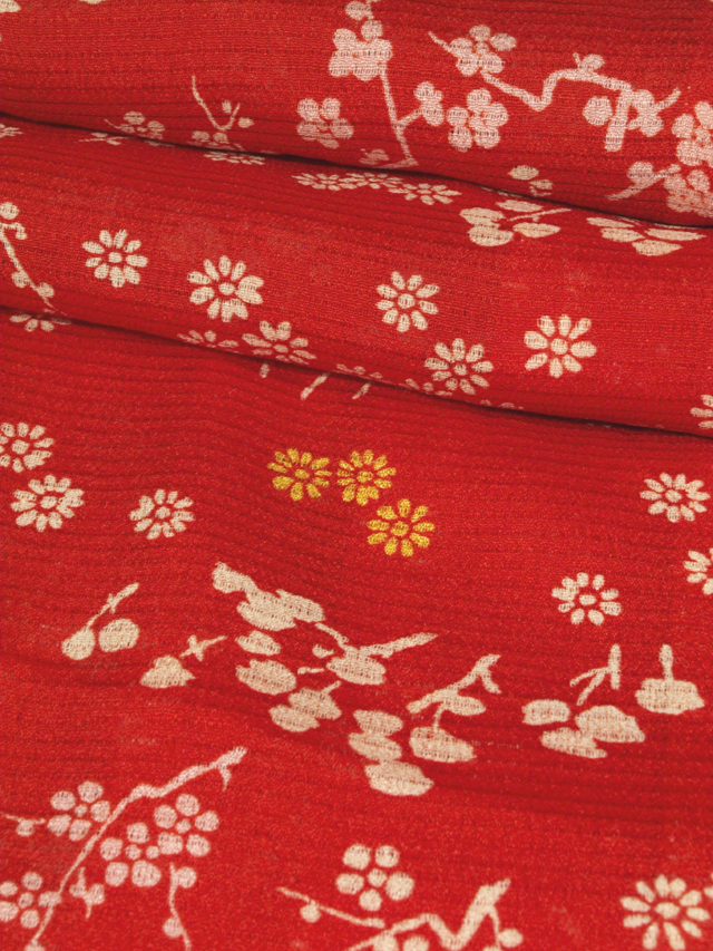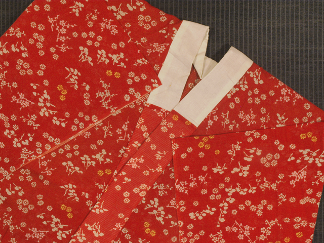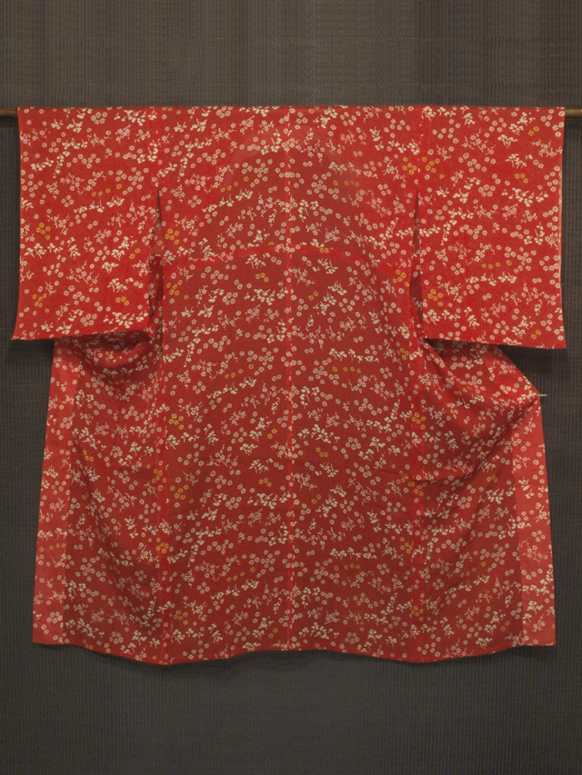 猩猩緋(しょうじょうひ)色の地に、菊や梅などの草花の文様が染められている、絽縮緬の長襦袢です。単衣仕立てで、袖口の始末はありません。 大正から昭和初期ごろにつくられたと思われるアンティークのお品です。やわらかで、ややシャリ感のある絽縮緬地です。 地衿が黄変気味で、直径約 2-3mm の黄変がところどころにあります。また、上前身ごろの胸上、胸下に直径約 1mm の小穴が各 1 か所あります。そのほかに目につく大きなしみやよごれ、褪色などのダメージはなく、この時代のものとしてはきれいな状態なので、小穴を繕ってしまえばご着用は可能ですが、上記のとおり、小穴があるため、状態ランク=「D」のご着用対象外、リメイク素材用とさせていただきます。 |