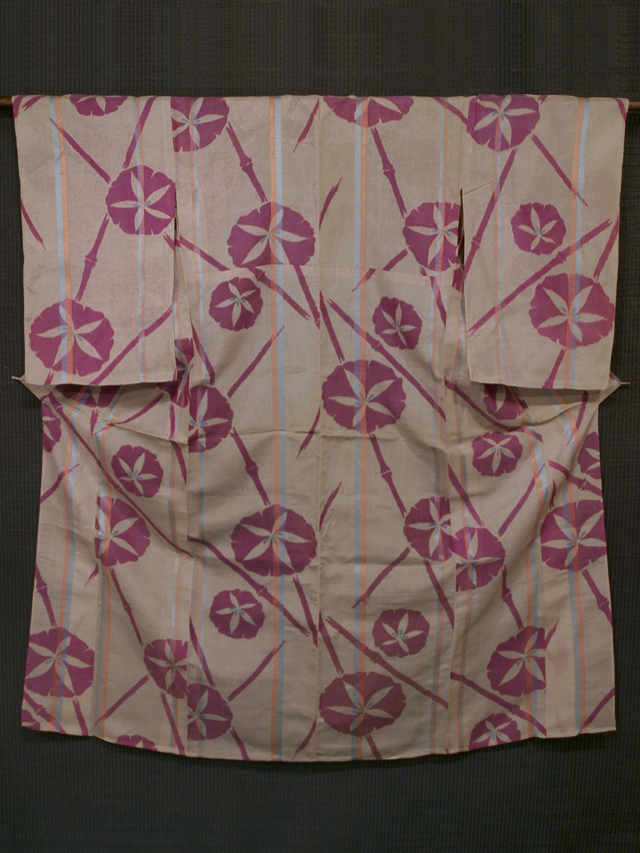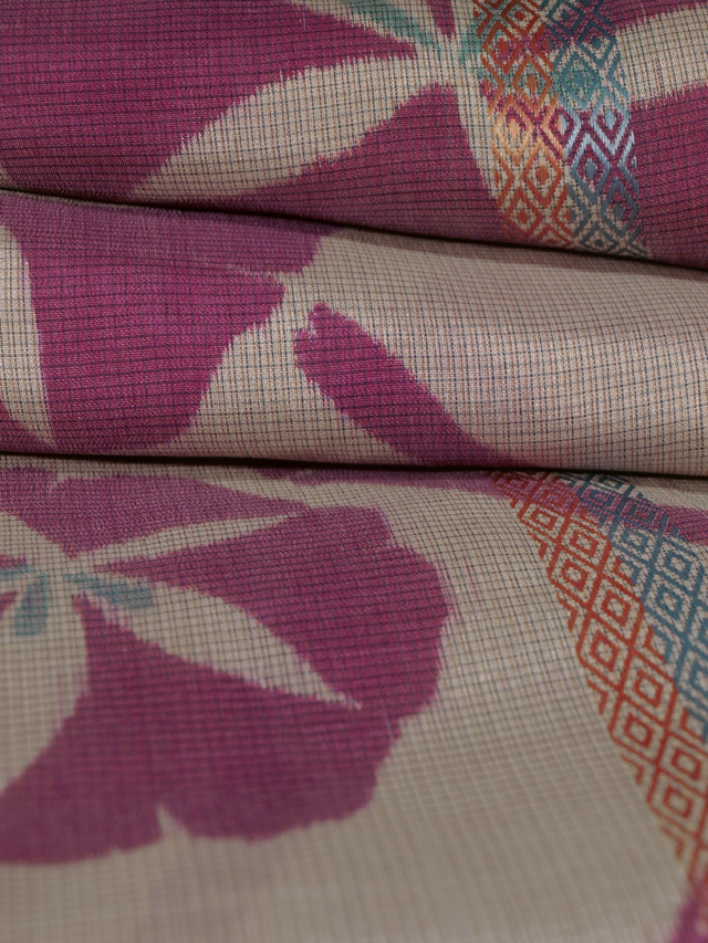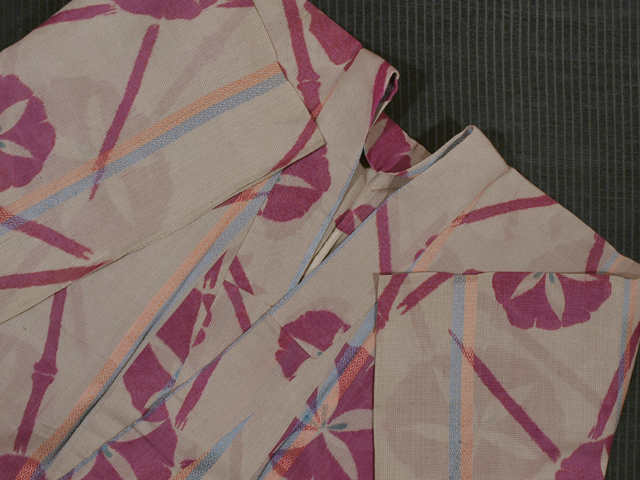 全体的な印象としては、練(ねり)色といった感じの地に、沈んだ天(あま)色と沈んだ躑躅(つつじ)色の格子縞と菱の配された、沈んだ天色と淡い鉛丹(えんたん)色のたて縞の地紋、朝顔の絡んだ竹垣の文様が織り込まれている、銘仙絣です。単衣仕立てです。 大正から昭和初期ごろにつくられたと思われるアンティークのお品です。やや透け感があります。 こまかなくすみやうすよごれが、糸引きがちらほらと若干ありますが、そのほかに目につく大きなしみやよごれ、褪色などのダメージはなく、この時代のものとしては、とてもきれいな状態です。 |