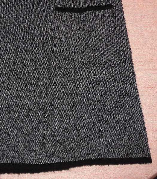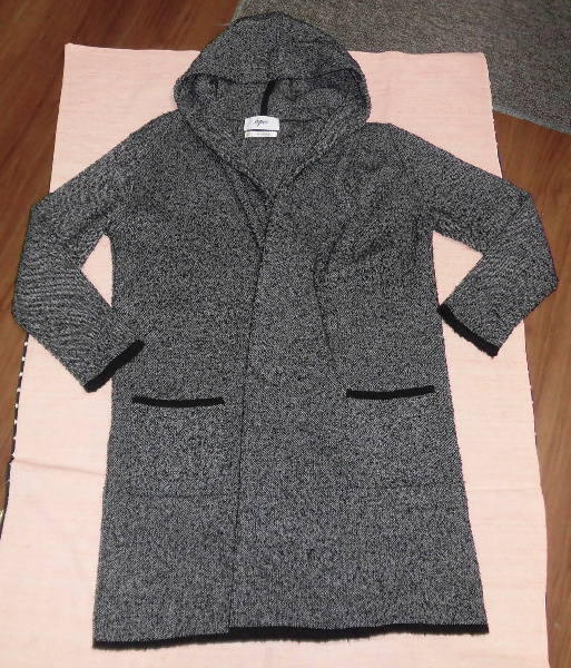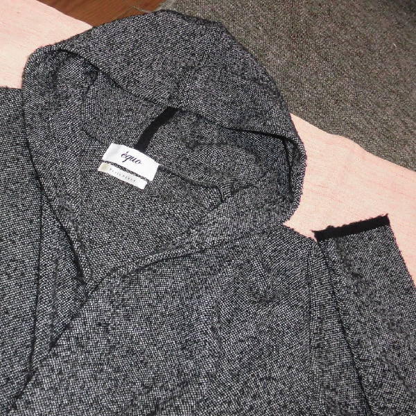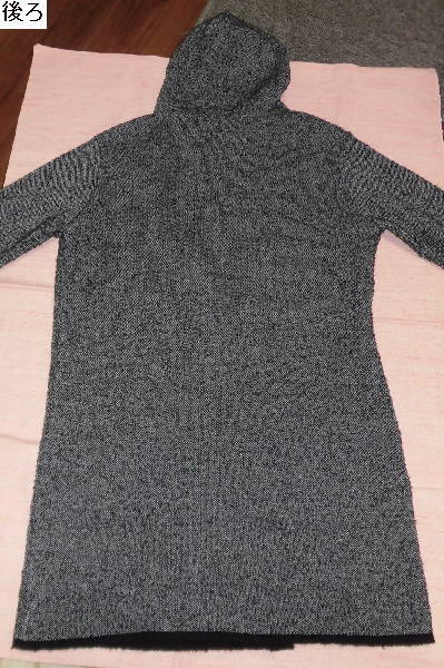 | よく着用しましたので、袖に毛玉のような、毛羽立ちのようなものが見られます。 それ以外は比較的キレイです。 ☆ サイズ表示なし、フリーだと思います ☆ 色は濃いグレー・黒系 ☆ 実寸は、身丈87センチ、肩幅44センチ、袖丈55センチ、 脇下の幅55センチ、裾幅56センチ ☆ アクリル58%、毛26%、ナイロン16%、裏地なし、やや薄手 ☆ フードあり ☆ ポケット2つあり ☆ 前を留めるものなし エクオ ペルルペッシュ イエリデザインプロダクツ | ||