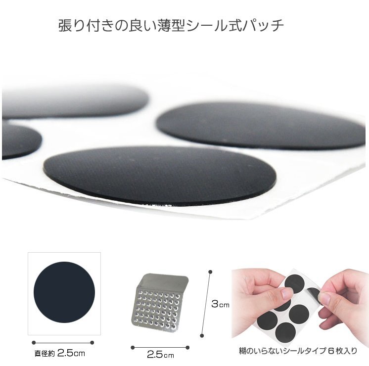 接着剤不要のシールタイプ(丸型)修理パッチ6枚入り。