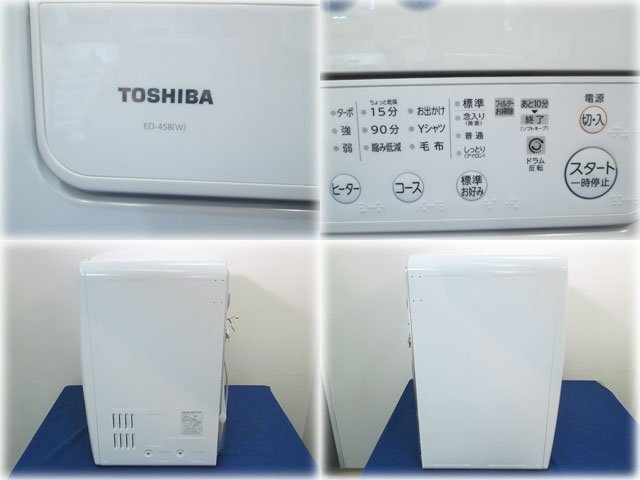 東芝 電気衣類乾燥機 ED-458(W) を出品いたします。 ■特徴■ 花粉フィルター搭載で、 ふんわり清潔仕上げ 花粉フィルター 花粉フィルターでスッキリ! 小さな粒子もとらえる花粉フィルターを搭載。 繊維の奥に入った花粉も スッキリ取り去って清潔にします! 衣類についた花粉を90%以上除去できます。 からみまセンサー からみをほぐして、ふんわり! からみまセンサーが衣類のからみを検知すると、 ドラムを反転させてほぐします! ターボ乾燥 ヒーターのパワーと風量アップで 乾燥時間を短縮! *標準コースとの比較において。 ■仕様■