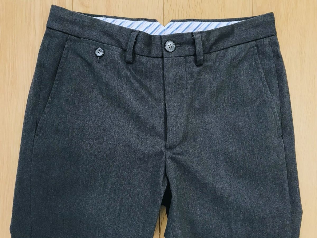 | サイズ |    表記S(実寸/ウエスト:76cm もも幅:27cm 裾幅:16.5cm 股上:24cm 股下:72.5cm)|    色   |      グレー   |     素材   |      ポリエステル63 綿34 ポリウレタン3%   |     コンディション   |      7.5     |   |