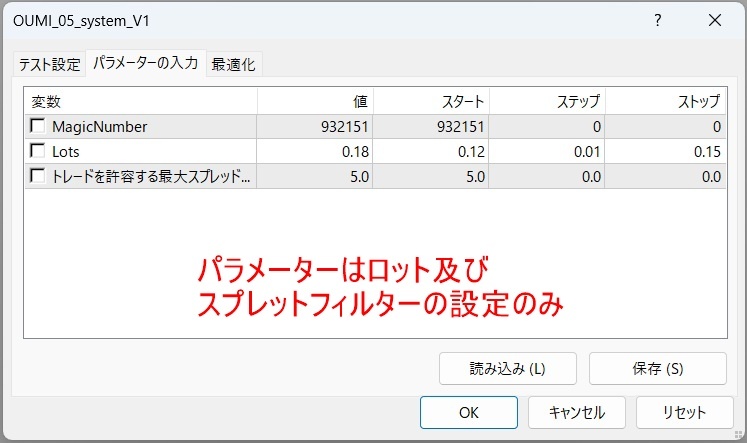 ※基本的にはロット及びスプレッドフィルターのみ調整して頂くカンタン設定です。