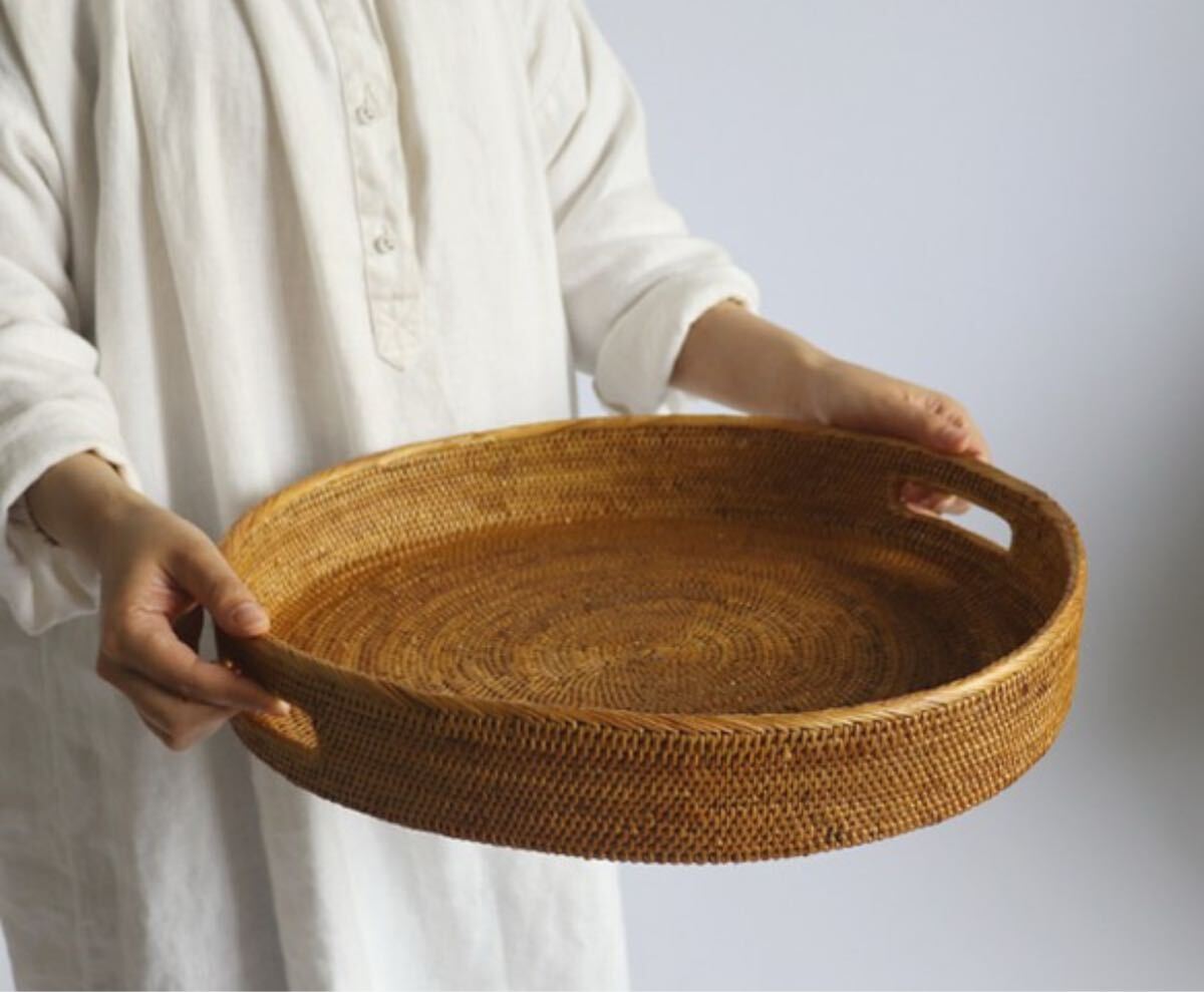 伝統工芸アタ細工 直径50cmトレー サークル 丸盆 持ち手付キッチン雑貨 未使用品 カゴ 籠 バスケット インテリア 天然素材 かご