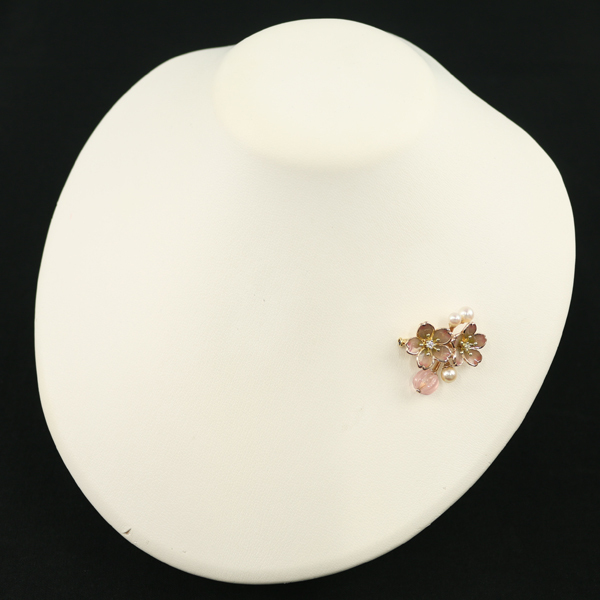 柔らかなローズクォーツの輝きにアコヤ真珠の艶やかさをつぼみに飾ったサクラモチーフが美しい ミキモトのブローチ。繊細な彩のエナメルに厳選ダイヤの瑞々しさが美しく輝く素敵な一品ですよ。 |