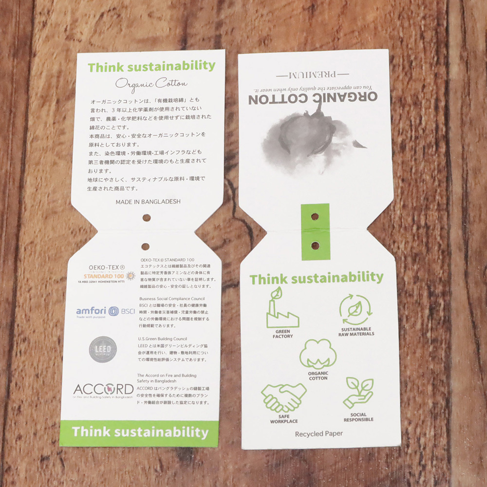 有害物質を含まないことを証明するエコテックス認証、労働環境に配慮した生産背景を示すBSCI認証を取得しており、着る人にも作る人にもやさしいものづくりを大切にしています。