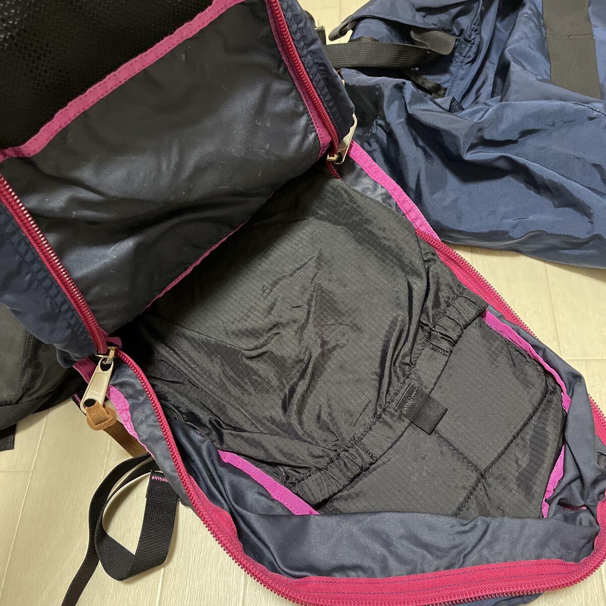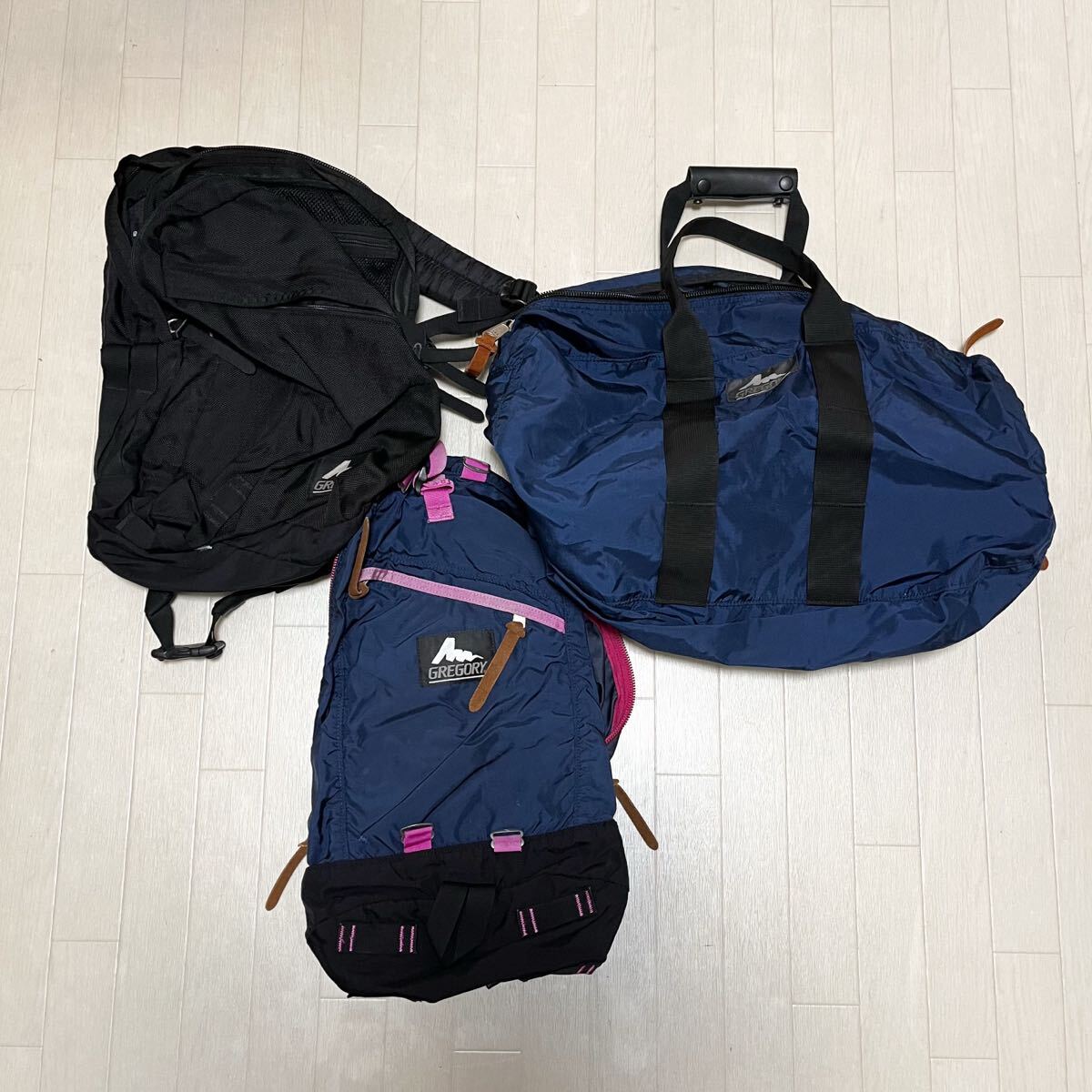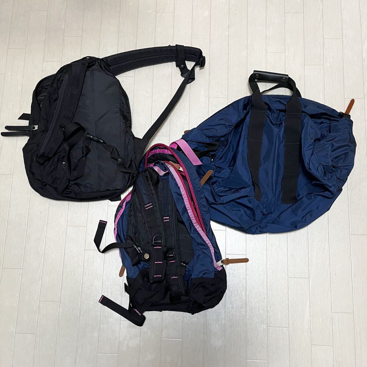 ネイビーリュックにダメージあり、ネイビーボストンバッグのショルダー欠品、またボストン内側に劣化?による臭いあります。