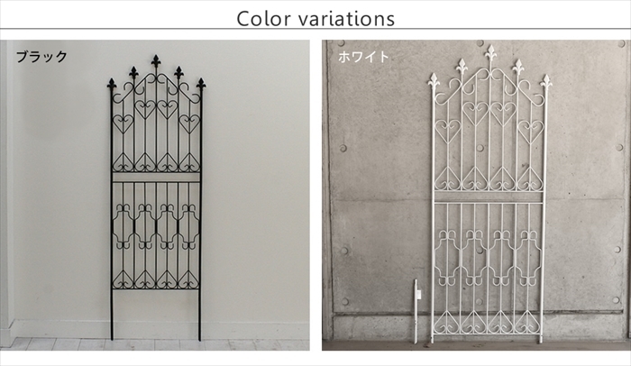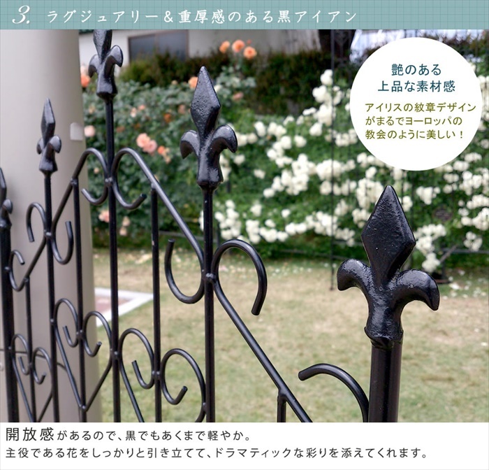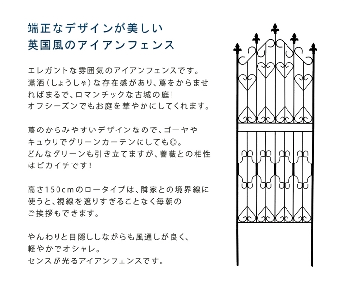 | 端正なデザインが美しい英国風のアイアンフェンス。 エレガントな雰囲気のアイアンフェンスです。 瀟洒(しょうしゃ)な存在感があり、蔦をからませればまるで、ロマンチックな古城の庭! オフシーズンでもお庭を華やかにしてくれます。 蔦のからみやすいデザインなので、ゴーヤやキュウリでグリーンカーテンにしても◎。 どんなグリーンも引き立てますが、薔薇との相性はピカイチです! 高さ150cmのロータイプは、隣家との境界線に使うと、視線を遮りすぎることなく毎朝のご挨拶もできます。 やんわりと目隠ししながらも風通しが良く、軽やかでオシャレ。 センスが光るアイアンフェンスです。 |