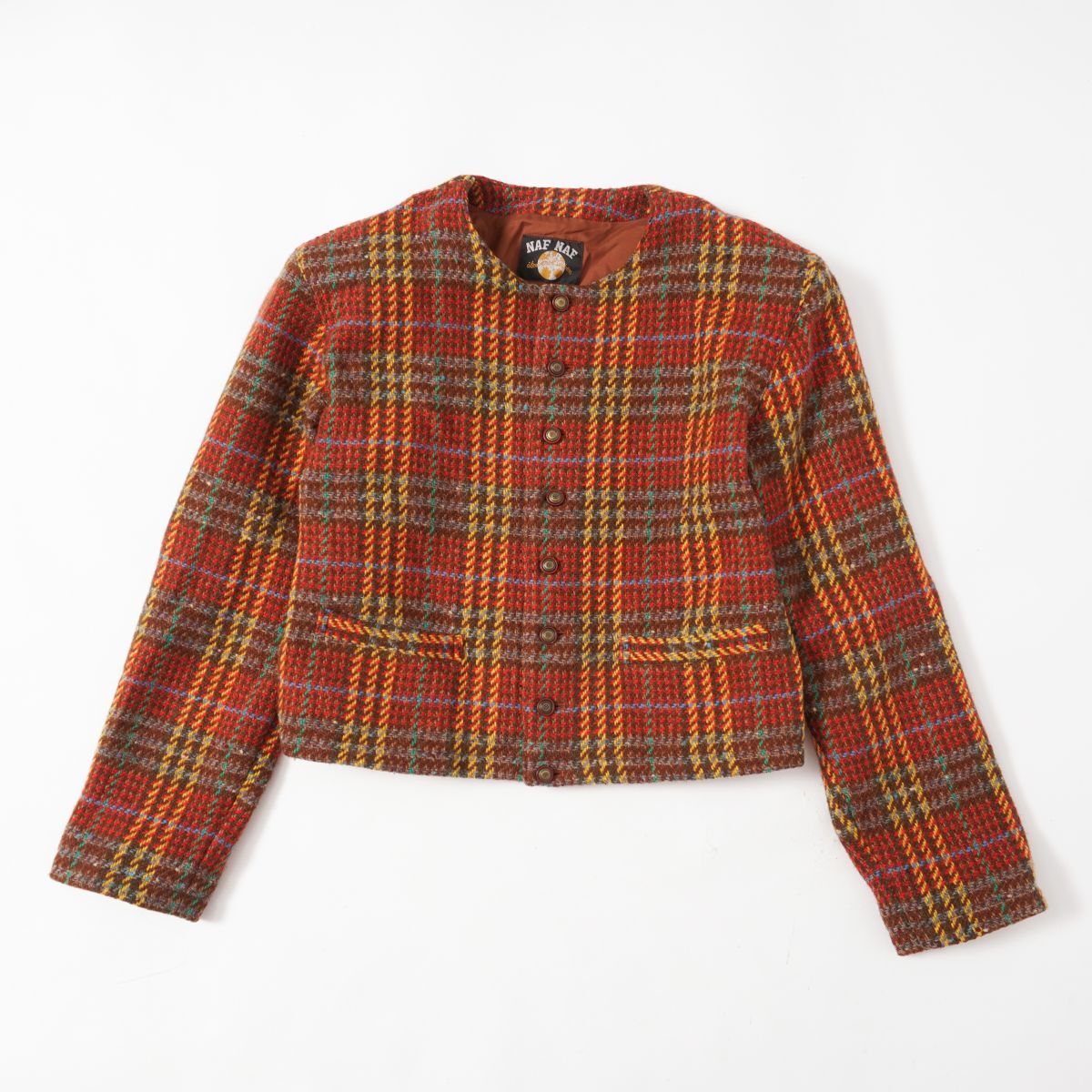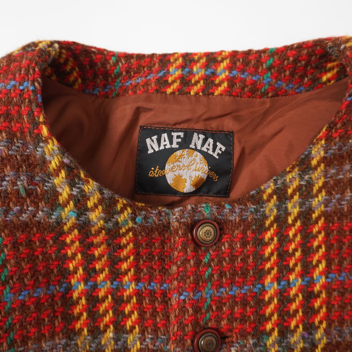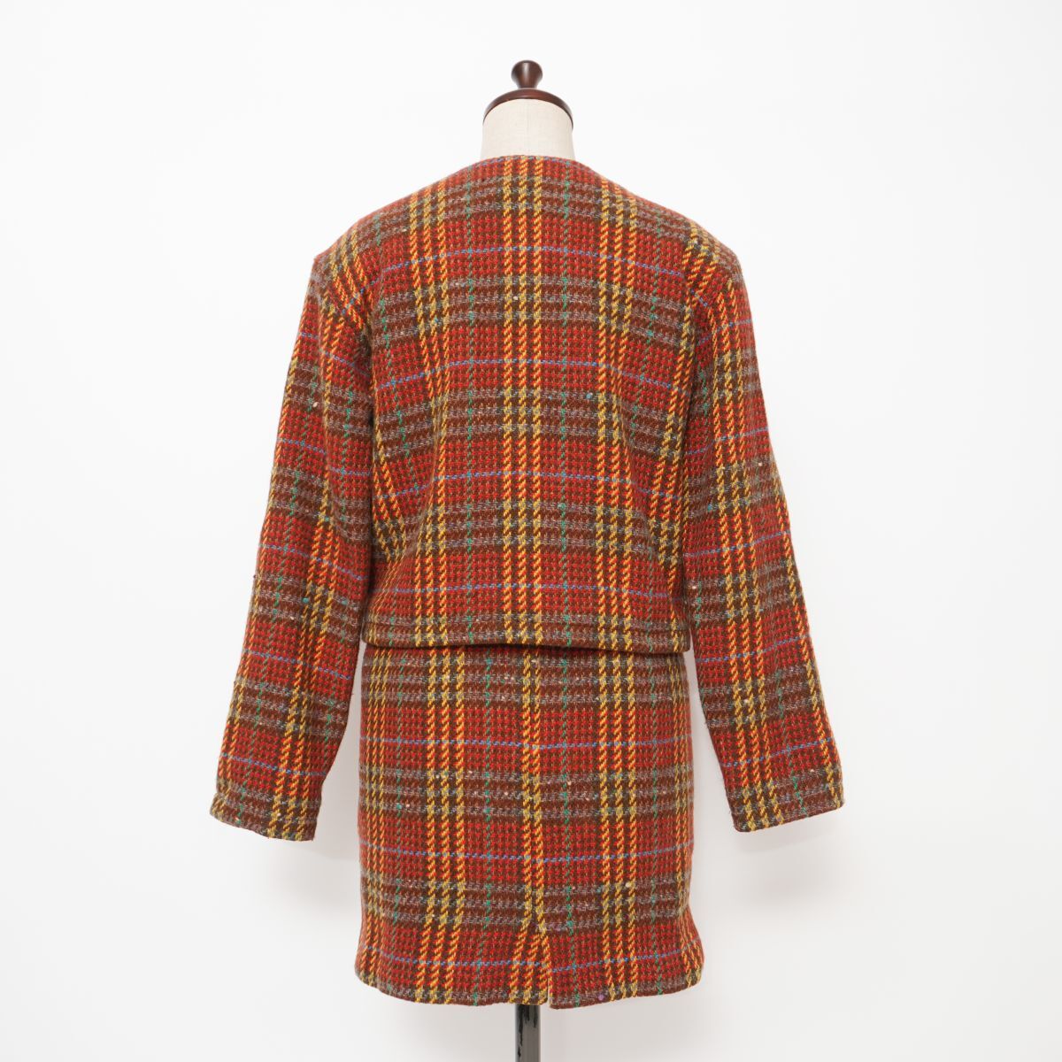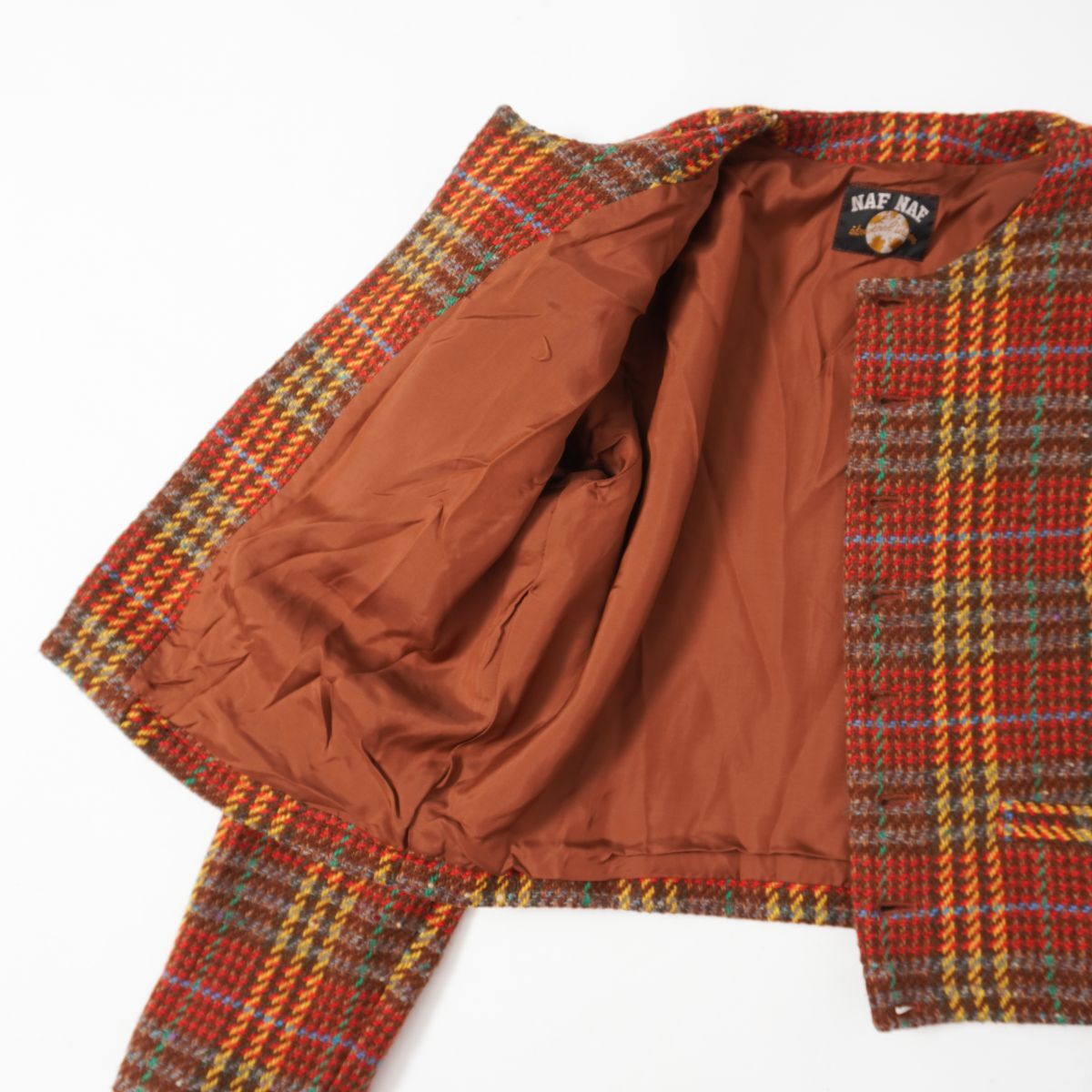 美品 NAF NAF ナフナフ チェック柄マルチツイードセットアップ ノーカラージャケット タイトミニスカート ベルト 赤 レッド サイズM*KD182
