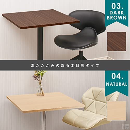 落ち着きのある木目調デザインから高級感漂う大理石調などお部屋に合わせやすい豊富なカラー展開。 60cmの天板はカフェを楽しんだりノートパソコンを置いて、ちょっとしたお仕事をするのに適したサイズ感となっております。 お手入れや組立ても簡単なダイニングテーブルです。天板表面は汚れや水に強いPVCシートを使用している為、サッと拭いて簡単にお手入れできます。