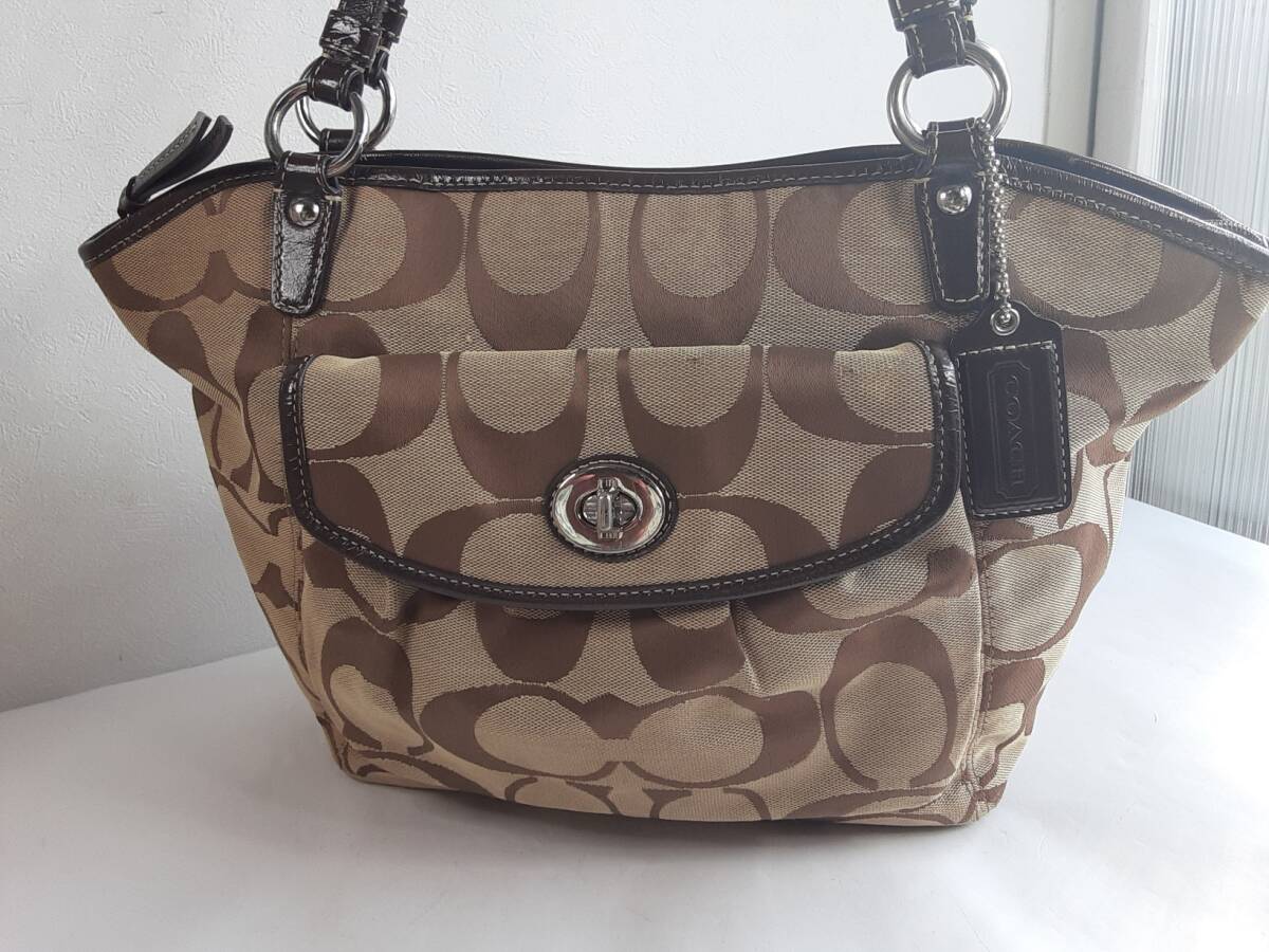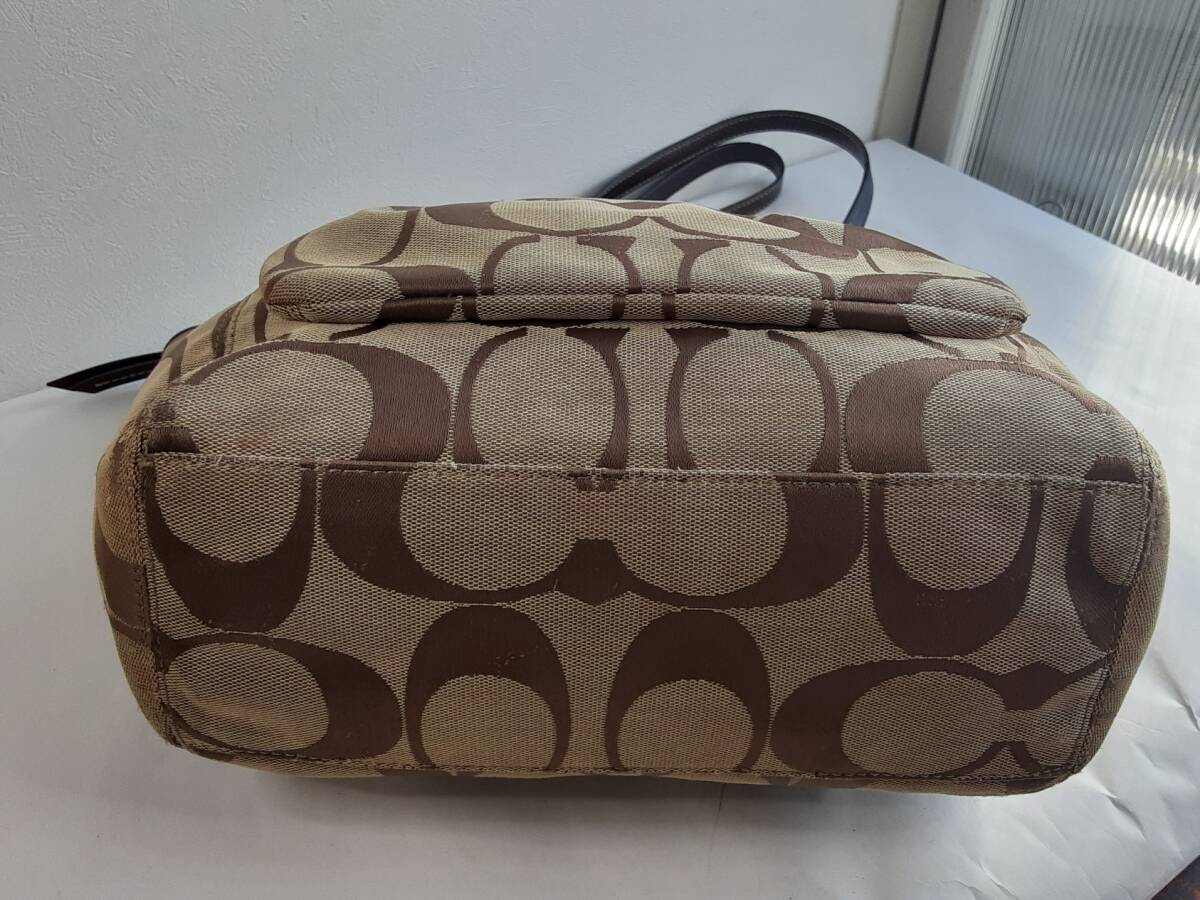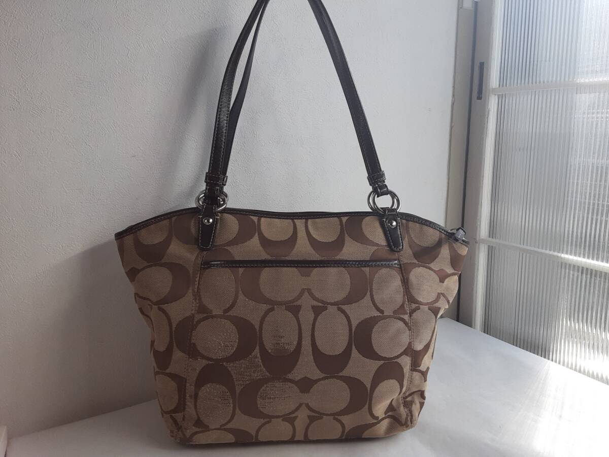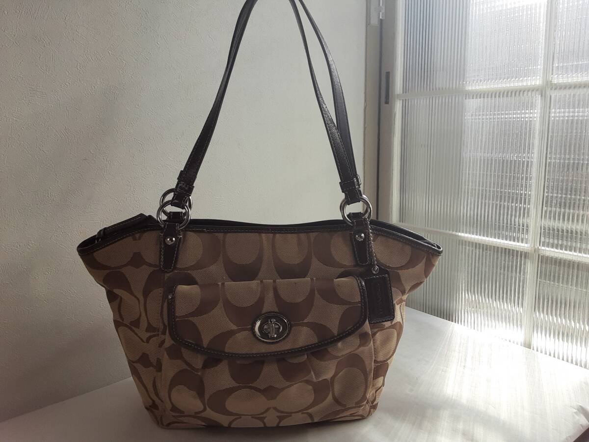 ベージュ系シグネチャーキャンバスにブラウンレザーが素敵なデザインの大き目サイズのバッグで、COACHチャームプレートが飾られたとっても可愛い逸品です。