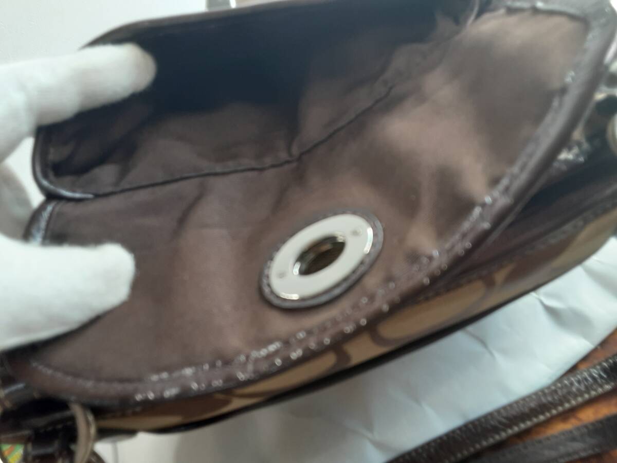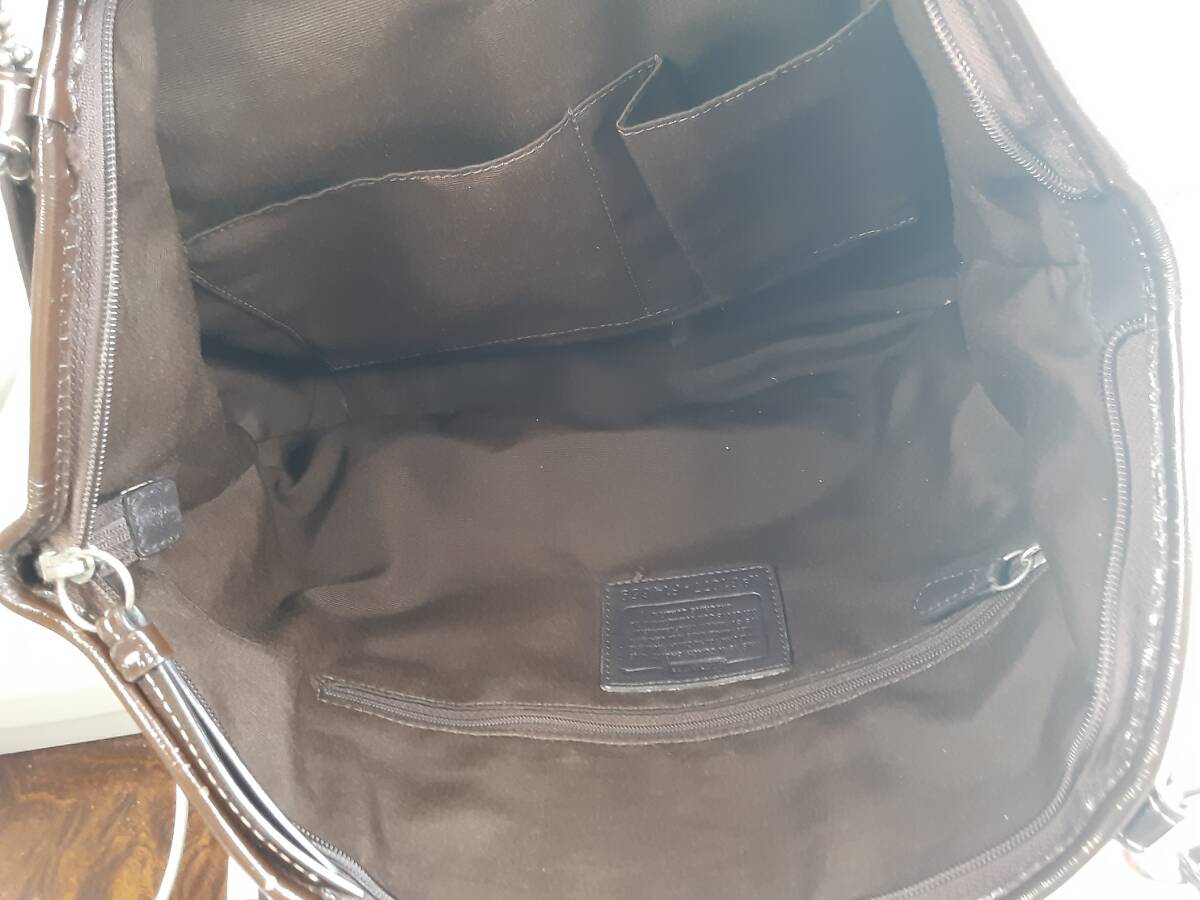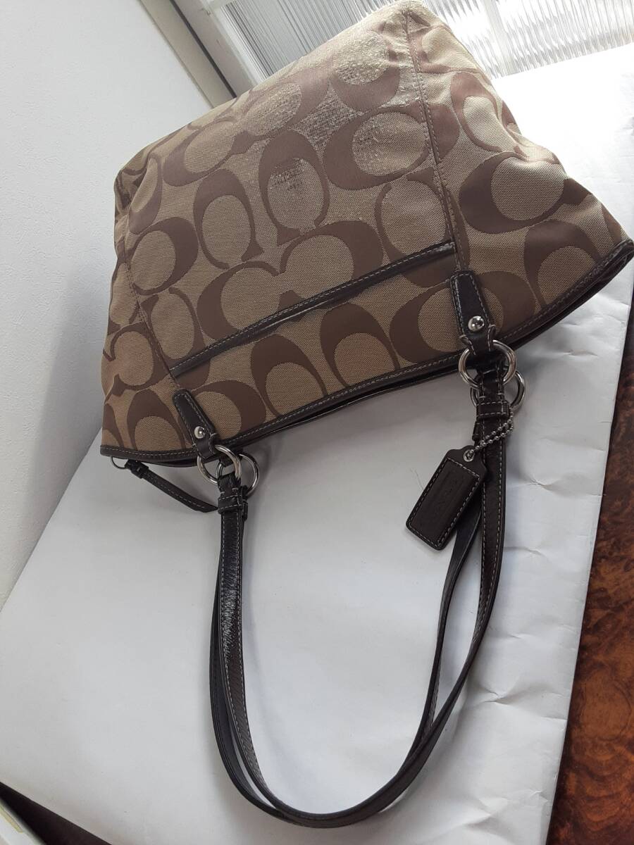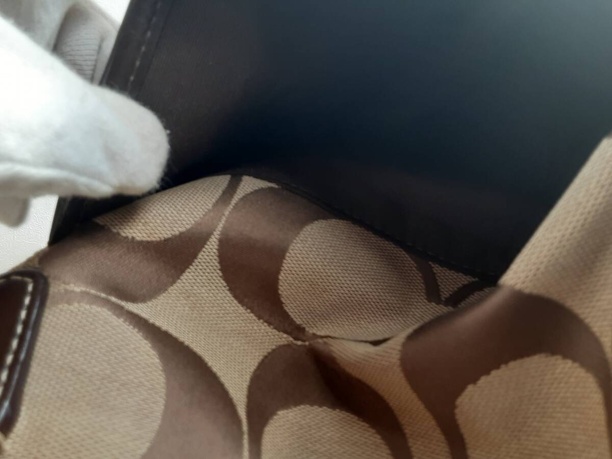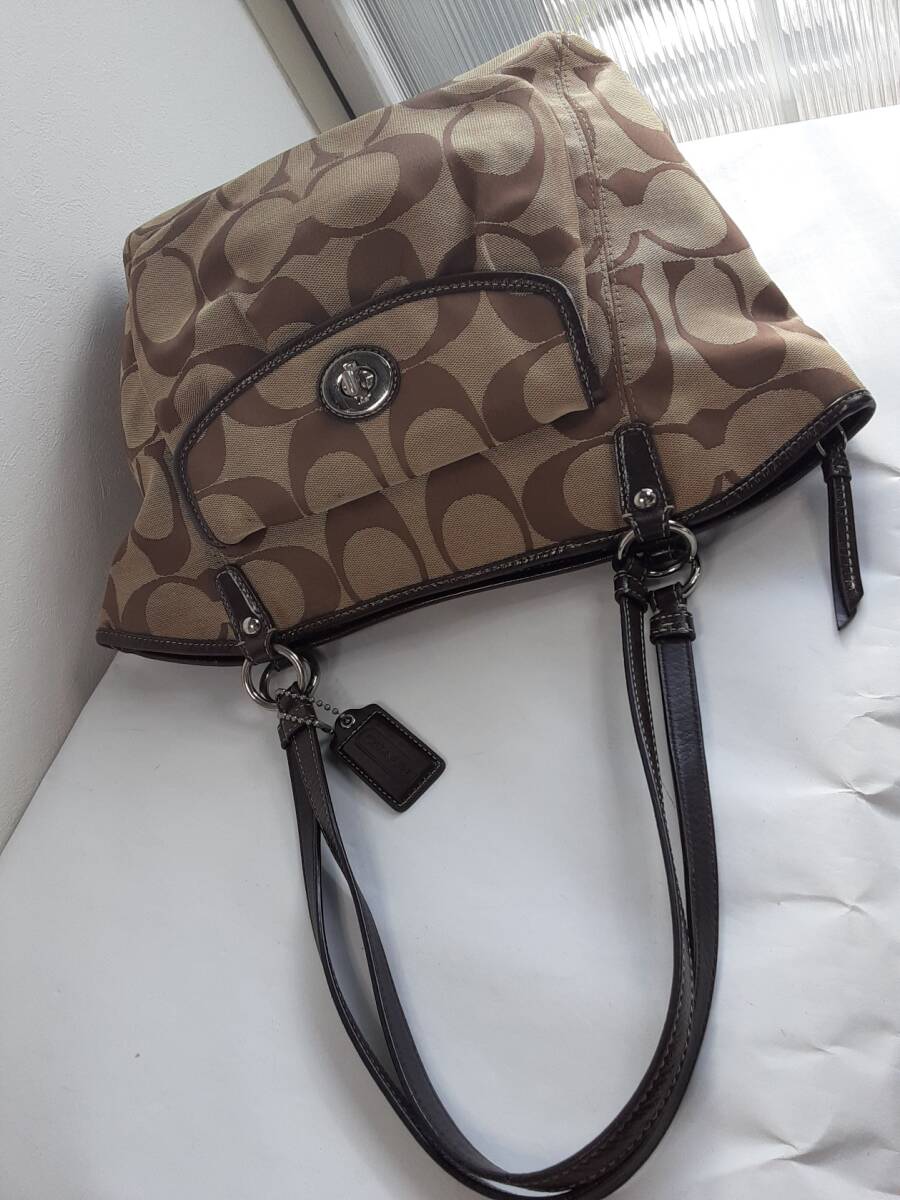 ベージュ系シグネチャーキャンバスにブラウンレザーが素敵なデザインの大き目サイズのバッグで、COACHチャームプレートが飾られたとっても可愛い逸品です。