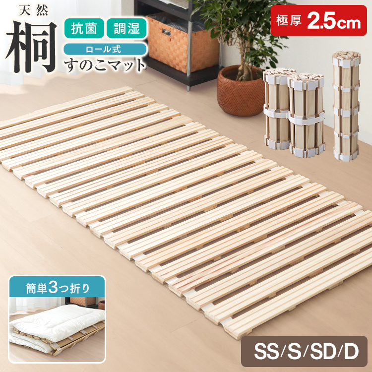 通気性抜群で湿気を抑制します。 風を通しやすい極厚2.5cm。 床からの高さを設けることで通気性を高めています。 ロール式なので、使わないときはコンパクトに収納できます! 付属のマジックテープでくるっと巻いて固定します。 天然の桐材を使用。抗菌・防虫・防腐効果があります。 桐は、断熱性と保温性に優れ、寝具を床の冷たさから守ります。 安全性を考慮してマットの角には面取り加工が施されています。 さらに床の傷つきを防ぐためのクッション材付き!。 家族みんなで安心して使えます。 【商品仕様】 カラー:ナチュラル サイズ:(約)幅120×奥行き200×高さ2.5cm すのこ厚:(約)2.5cm すのこ幅:(約)7cm すのこ間隔:(約)3.4cm 重量:(約)8kg(1ロール 4kg) 素材:天然木(桐材)、EVA 他 【注意事項】 ・すのこの上に立つ場合はさん木の上に足をかけるなど強度の弱い部分に体重がかからないようにご注意ください。 ・飛び跳ねたり、一点に荷重をかけたりすると割れる恐れがあります。 ・製造時期によっては若干色味が異なる場合があります。 ・商品は、モニターによって色合いが異なって見える場合があります。 ・仕様・デザインは改良のため予告なく変更することがあります。 |