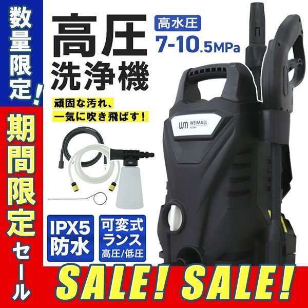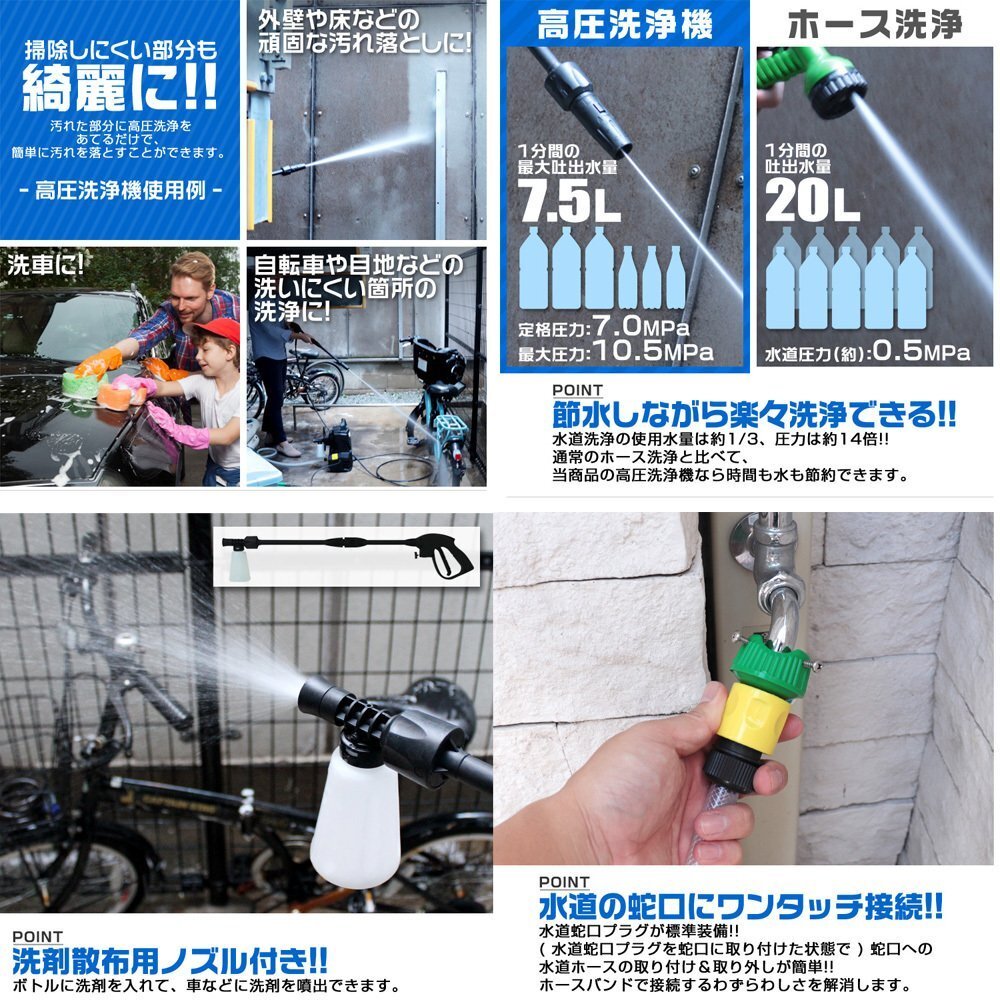 | 車や壁面、水回りなどの掃除に最適♪ 最大吐出圧力10.5MP、最大吐出水量750L/hのハイパワー! 他にはない、クールなブラックカラー! 【商品仕様】 定格電圧:AC100V 定格周波数:50/60Hz 消費電力:1400W 定格吐出水量:5.0L/min 最大吐出水量:7.5L/min(450L/h) 定格圧力:70Bar(7MPa) 最大許容圧力:105Bar(10.5MPa) 許容水温:40℃以下 防水レベル:IPX5 騒音レベル:98dB 本体重量:約5.5kg 【商品内容】 ・本体 ・接続ランス ・トリガーガン ・高圧ホース(約5m) ・可変ノズル ・洗剤散布用ノズル(250ml) ・水道ホース(約3m) ・蛇口プラグ ・ノズルクリーナーピンとネジ 保証期間 7日間 ※使用開始時期や使用期間に関わらず、お買い上げ日から7日間です。 商品到着後から7日を過ぎますと、交換の際の往復送料はお客様負担となりますのでご了承ください。 場合によっては対応出来ないケースもございます。 |