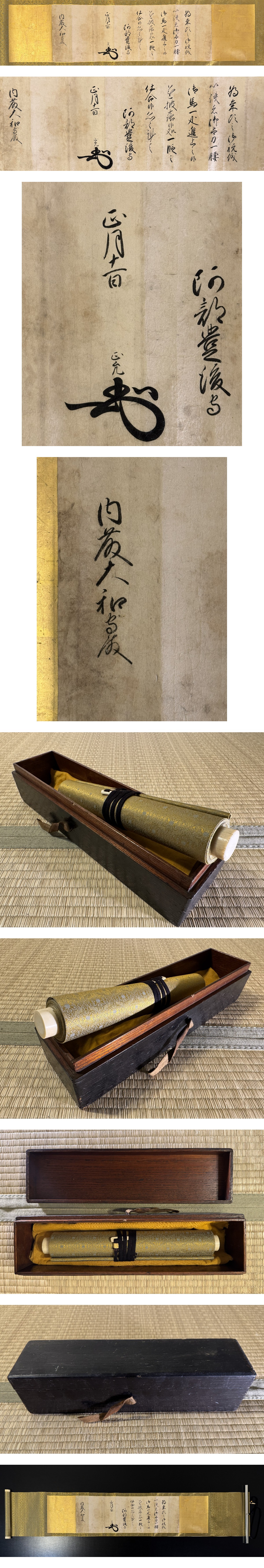 阿部 正允(あべ まさちか) 江戸時代中期の旗本、大名、老中。武蔵忍藩主。忠秋系阿部家5代。 はじめ正伊(まさただ)、正因(まさより)と名乗った。 5000石を領した旗本・阿部正晴(忍藩3代藩主・阿部正武の三男)の長男。はじめ父の跡を継いで旗本となるが、宗家の忍藩阿部家に後継者がいなかったため伯父の正喬の養子となり、寛延元年(1748年)に養父の隠居により家督を継ぐ。翌寛延2年(1749年)に奏者番、宝暦12年(1762年)に大坂城代、明和元年(1764年)に京都所司代、明和6年(1769年)に西丸老中、安永8年(1779年)に本丸老中と幕府の要職を歴任した。藩政では、宝暦2年(1752年)に藩内の秩父で起こった年貢増徴反対一揆や、中山道筋で発生した伝馬騒動の鎮圧に奔走され、苦難を強いられた。安永9年(1780年)11月24日、死去。家督は従弟の正敏(正喬の五男)が継いだ。 表装 約22.5㎝ ×約126㎝ 本紙 約19㎝ ×約53.5㎝ 桐箱・ヤケ・巻物 【真作】江戸期 阿部豊後守 阿部正允 書状 内藤大和守宛 花押 消息 巻物 / 武蔵忍藩主 / 旗本・大名・老中 / 忠秋系阿部家5代 |