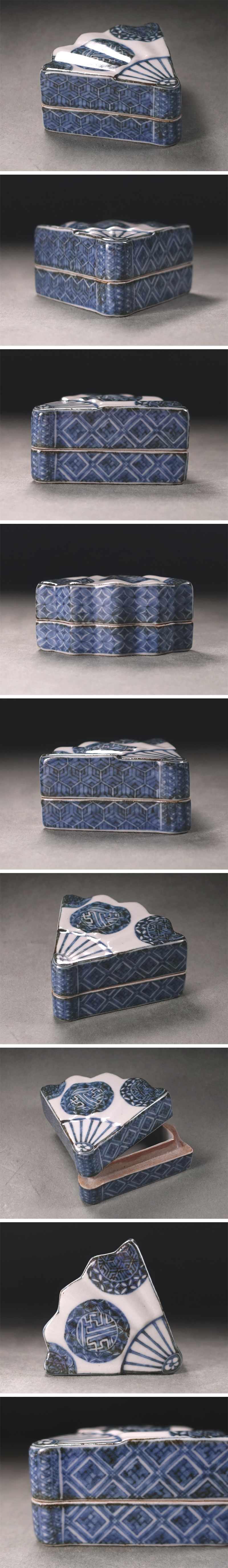 穢れのない落ち着いた色調の白磁に施された呉須発色はすこぶる鮮やかで、祥瑞文様を巧みに描き出して扇面の器としています。