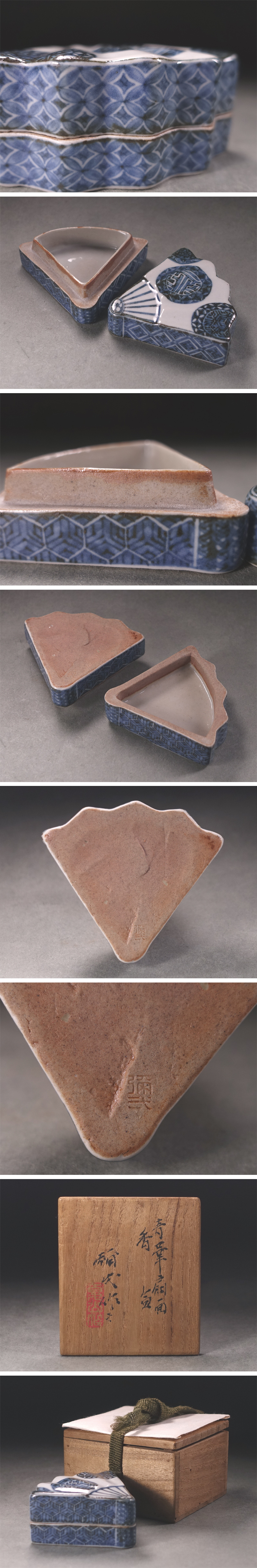 ∇花∇文化勲章受章作家【楠部彌弌(楠部弥弌)】作 唐物祥瑞写 青華扇面香合 共箱付