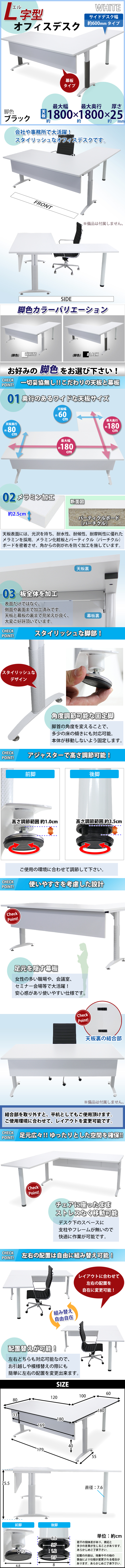 | 商品紹介 | ●●L字型オフィスデスク●● ■スタイリッシュなデザインかつ、作業スペースを広く確保出来る、L字型オフィスデスクです。 ■サイドデスクの幅が約600mmのタイプです。 ■会議室や事務所等、オフィス家具として様々なシーンでお使い頂けます。 ■天板と幕板は、表面に加えて側面や裏面まで加工を施しています。 ■全ての前脚先には角度調節可能な固定脚を採用。 ■足元を隠す幕板付きなので、女性が多いシーンでも大活躍!安心してご使用頂けます。 ■足元に支柱やフレームが無いので、チェアに座ったまま快適に作業出来ます。 ■左右の組み替え自由自在!配置替えが可能です。 ■日本語組立て書付き。 ■材質:パーティクル(パーチクル)ボード(メラミン加工)(天板、幕板)、スチール(フレーム)、プラスチック(脚裏) ■重量:約55kg ■付属品:工具(六角棒レンチ×1) ※こちらの商品は、組立て式です。 (組立てには付属工具とプラスドライバーや電動ドリルが必要です。プラスドライバーや電動ドリルはお客様でご用意下さい。) ●脚色のカラーはブラックとなります。 |