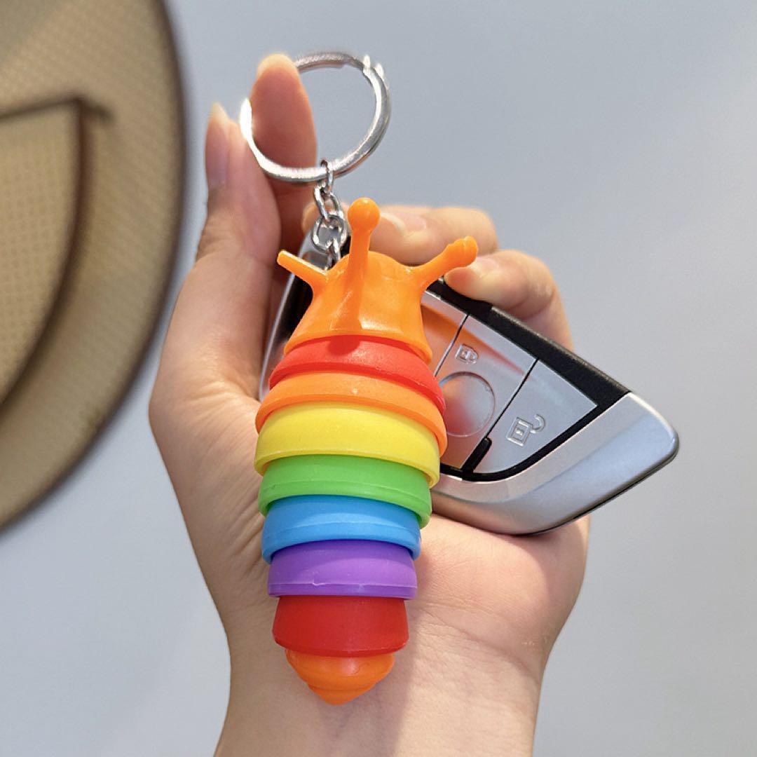 キーホルダーの本体は、複数のセグメントに分かれたナメクジの形をしており、それぞれのセグメントが異なるレインボーカラー(赤、オレンジ、黄、緑、青、紫など)で彩られています。このグラデーションが、まるで生きているかのような躍動感と視覚的な魅力を生み出しています。また、ナメクジの頭部には可愛らしい触角が表現されており、全体のデザインに遊び心とキュートさをプラスしています。