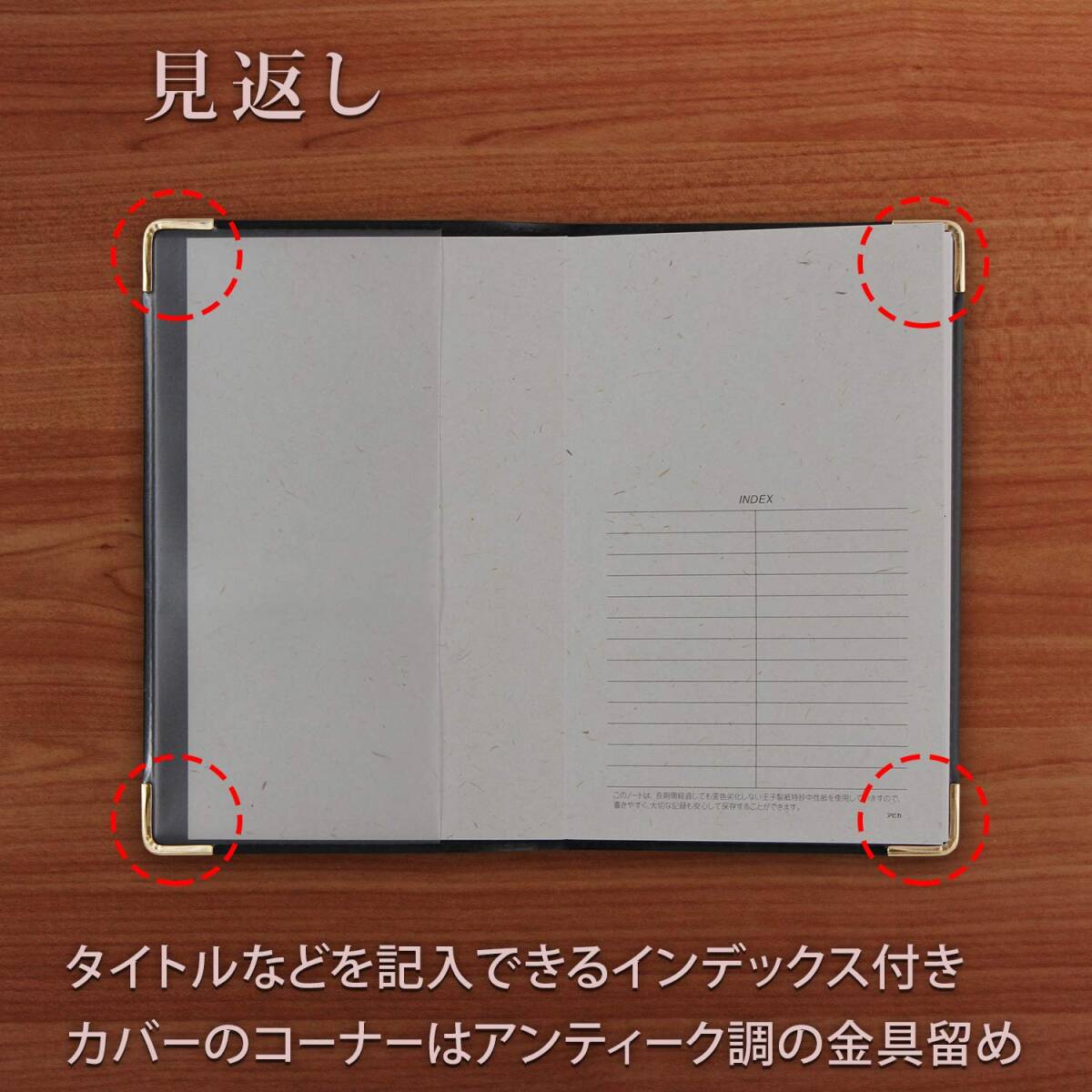 ・金の箔押し、アンティーク調の金具をコーナーに留めて、落ち着いた雰囲気に